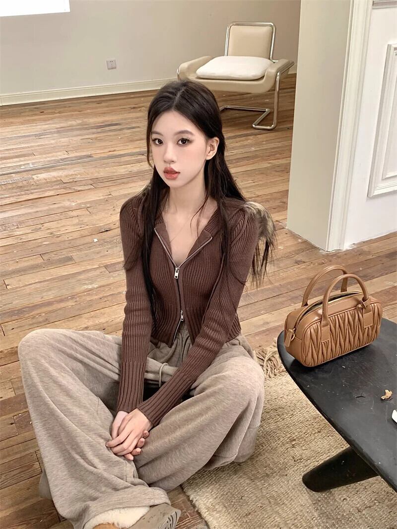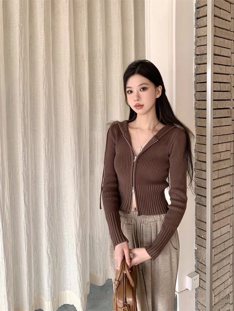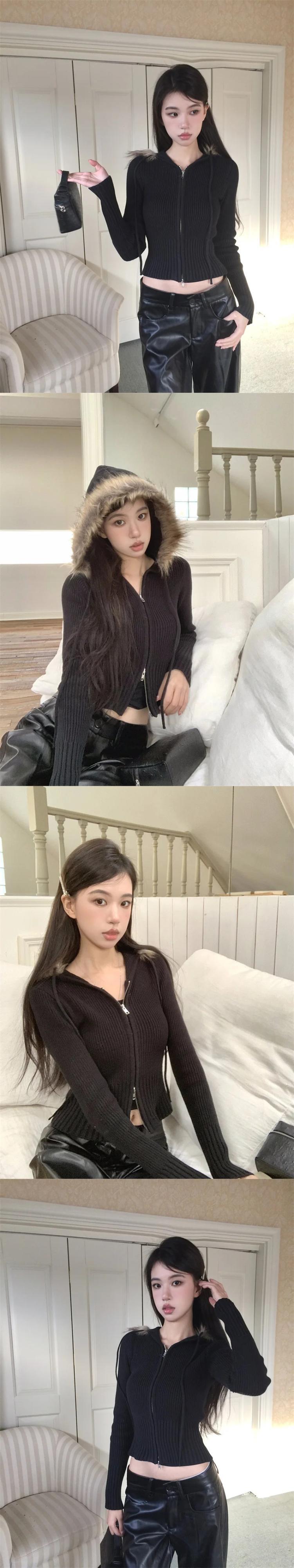 甘いホットガール毛皮パッチワークピットストライプフード付きニットカーディガン冬ダブルジッパースリムフィットセーター 大人ガーリー スウィート キュート カジュアル ウィンター 冬物