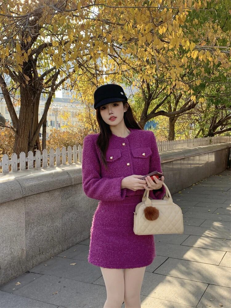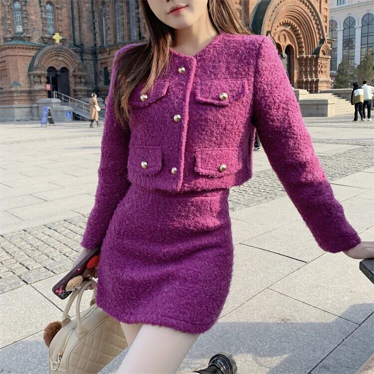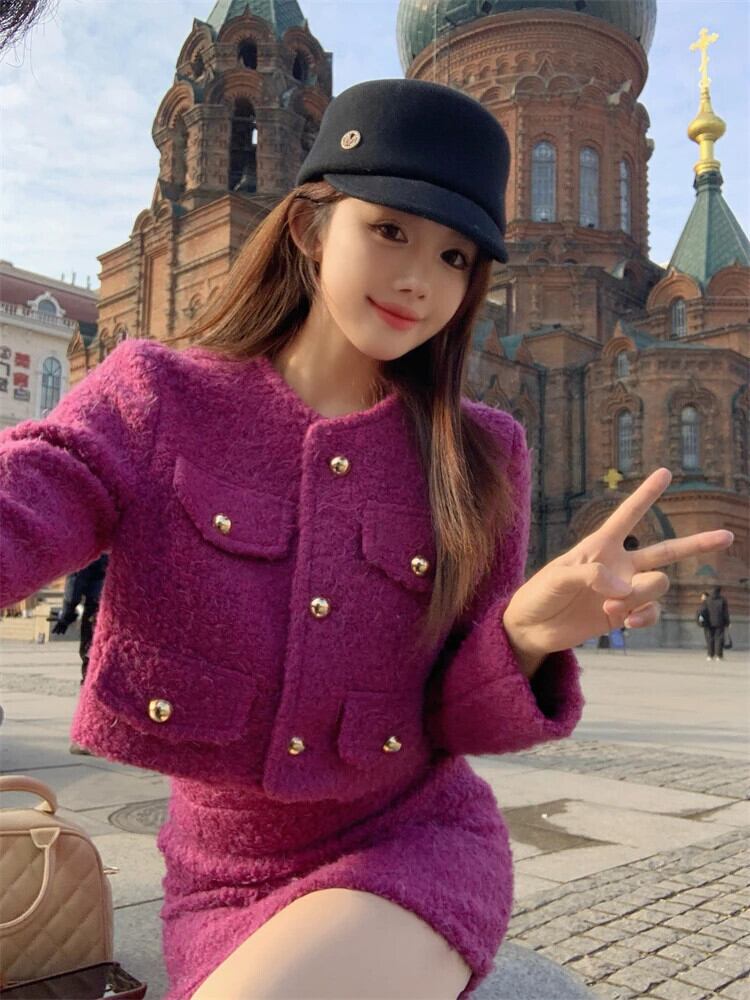 甘いホットガールスーツ秋/冬 O ネックショートコットンコートウエストミニスカート 2 点セット 大人ガーリー スウィート キュート カジュアル オータム 秋物 ウィンター 冬物 Oネック