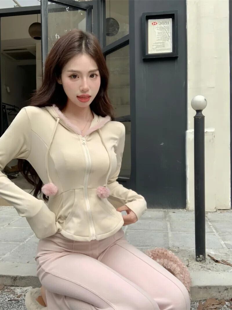 スイートホットガールスーツ春ファーボールフード付きジャケットウエストフレアパンツツーピースセット レッド 大人ガーリー スウィート キュート カジュアル スプリング 春物