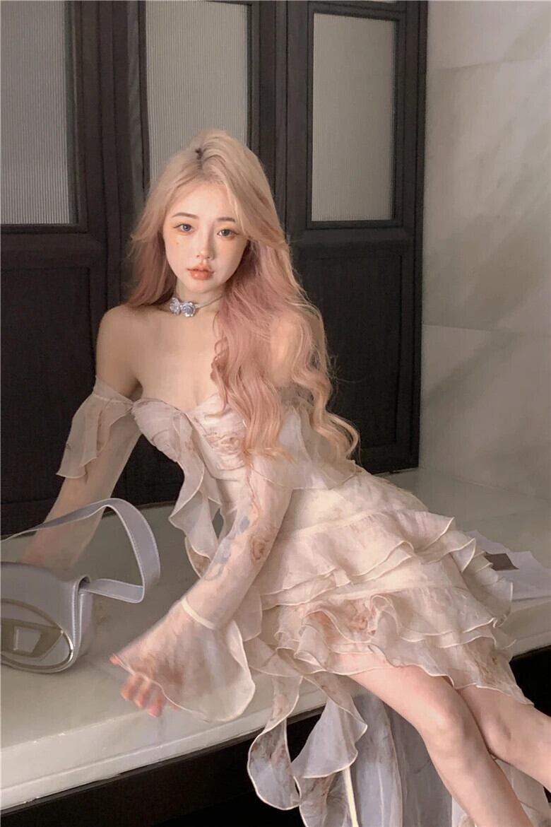 甘いホットガールセクシー絞り染めフリルドレス春スリムフィットオフショルダー不規則 A ラインロングドレス 大人ガーリー スウィート キュート カジュアル スプリング 春物 Aライン