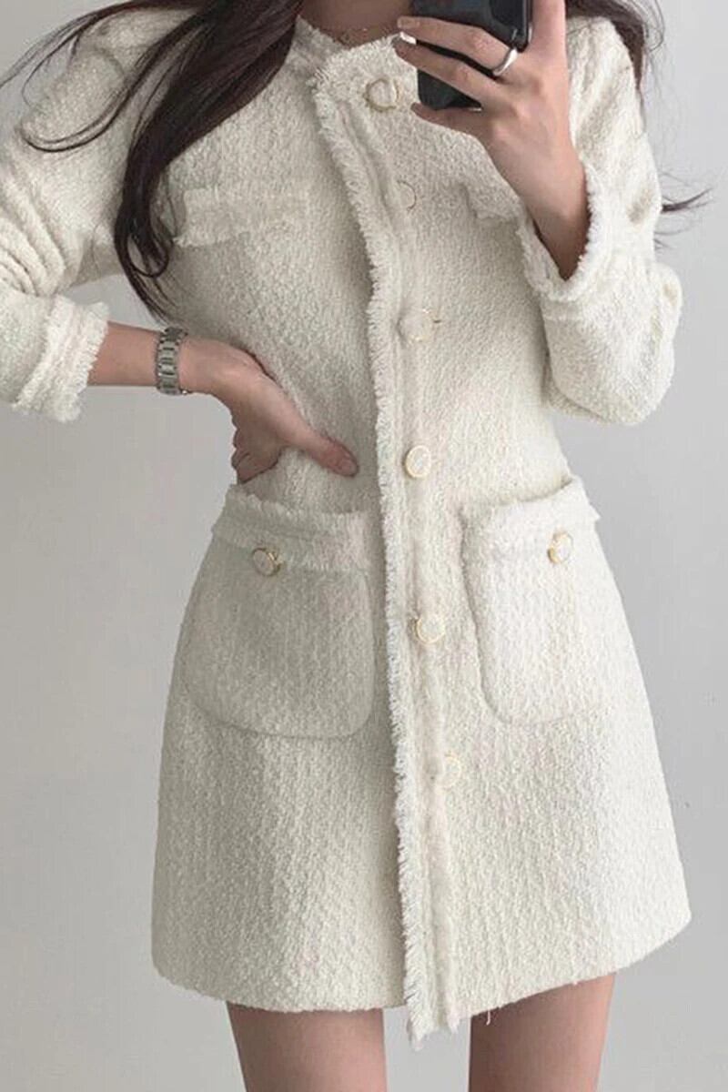 甘いホットガールシック O ネックツイードドレス秋/冬電話シングルブレストスリムフィット長袖ドレス ロング 大人ガーリー スウィート キュート カジュアル オータム 秋物 ウィンター 冬物 Oネック