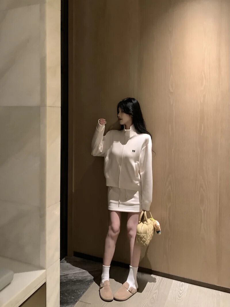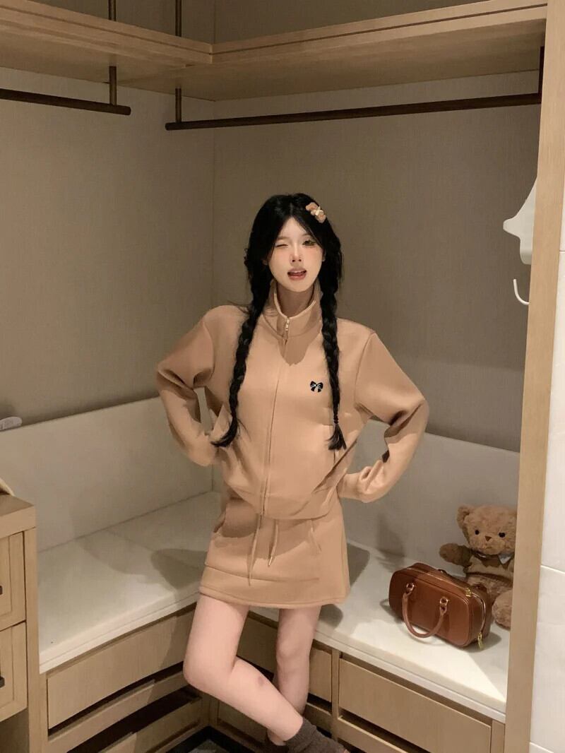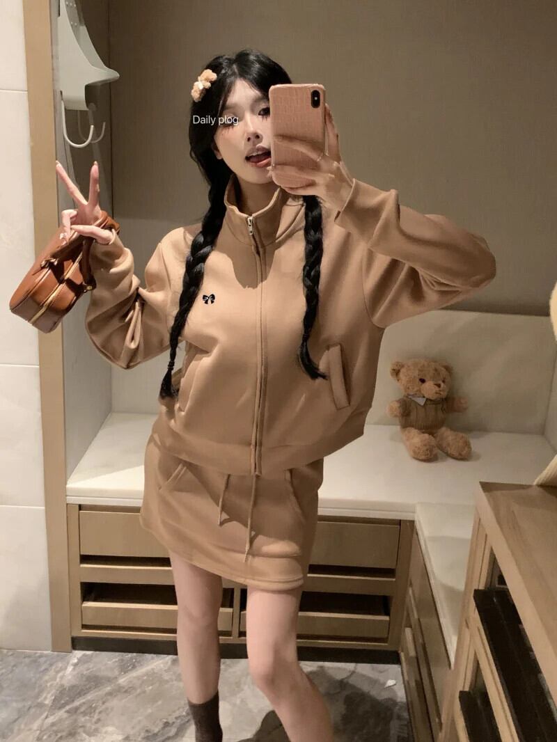 甘いホットガールスーツ冬弓スタンドカラージッパージャケット A ラインミニスカート 2 点セット リボン 大人ガーリー スウィート キュート カジュアル ウィンター 冬物 Aライン