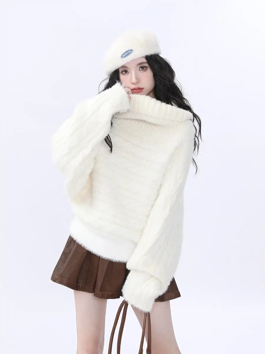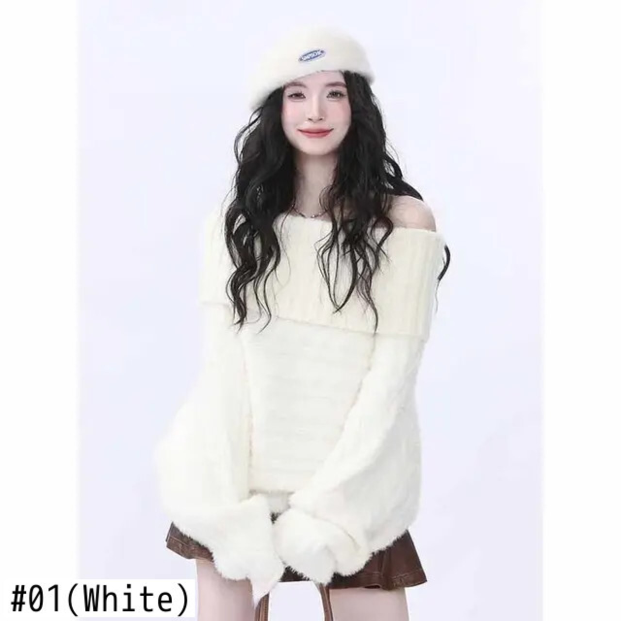 甘いホットガールオフショルダーレッドセーター秋と冬長袖ルーズ肥厚ツイストニットプルオーバー ロング 大人ガーリー スウィート キュート カジュアル オータム 秋物 ウィンター 冬物