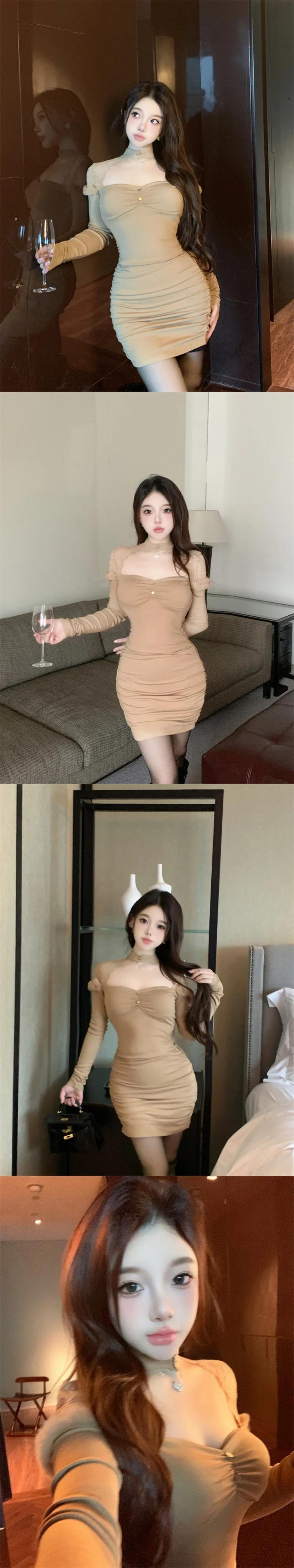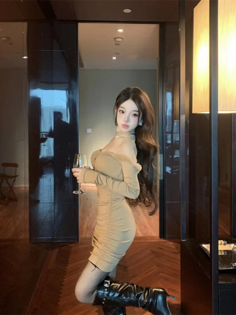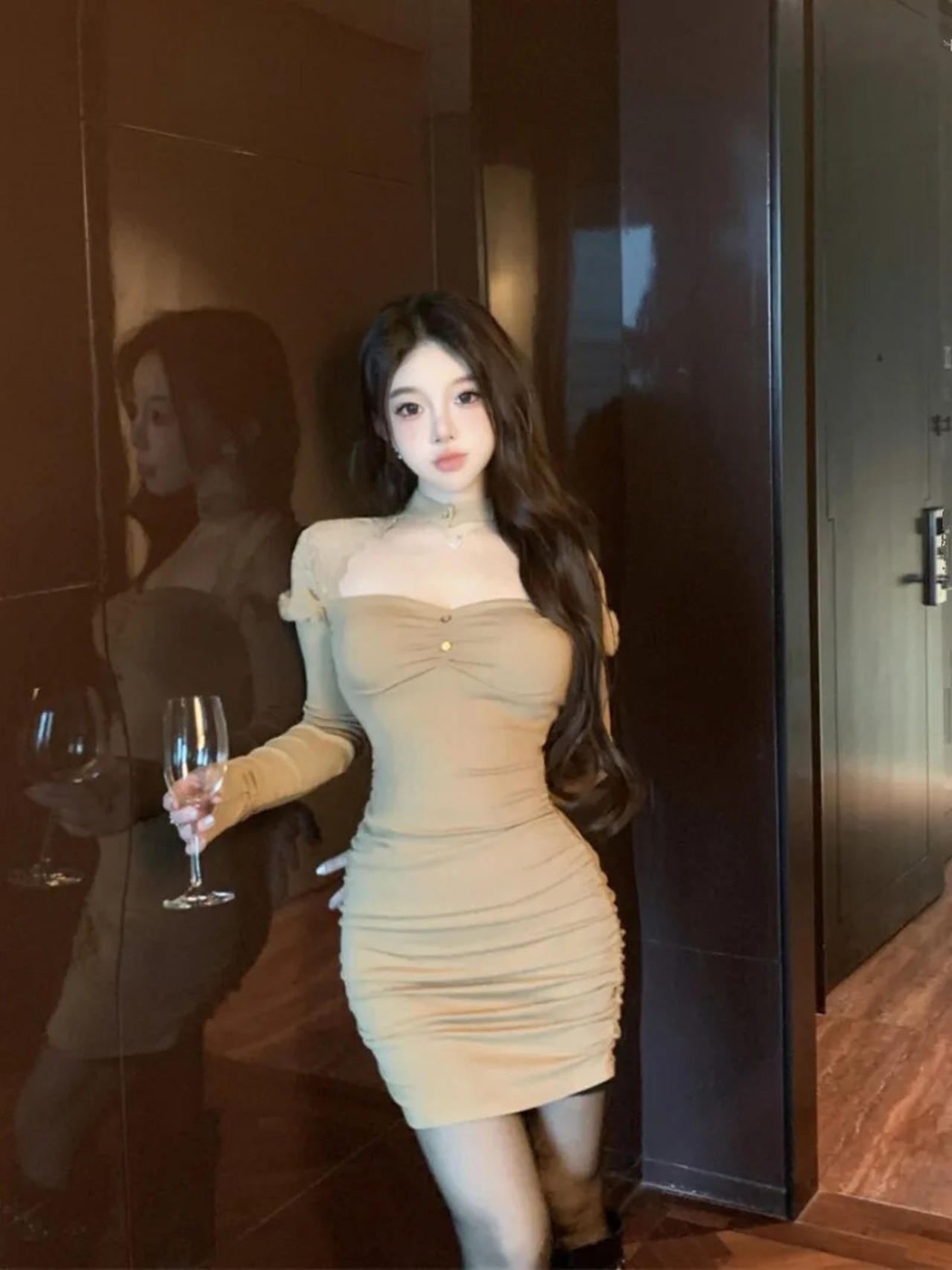 甘いホットガールホルターネックレース長袖ドレス春スリムフィットラップヒップショートドレス ロング 大人ガーリー スウィート キュート カジュアル スプリング 春物