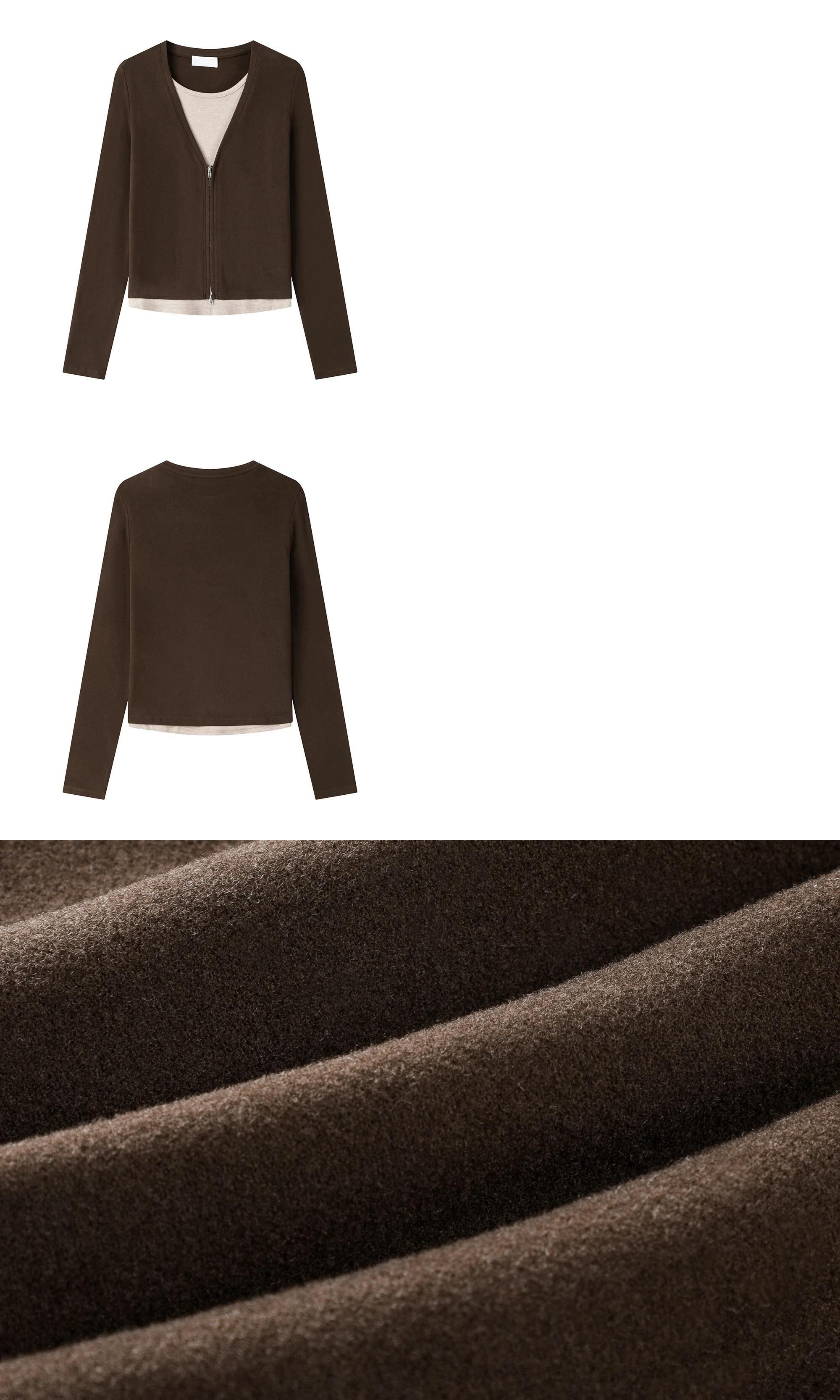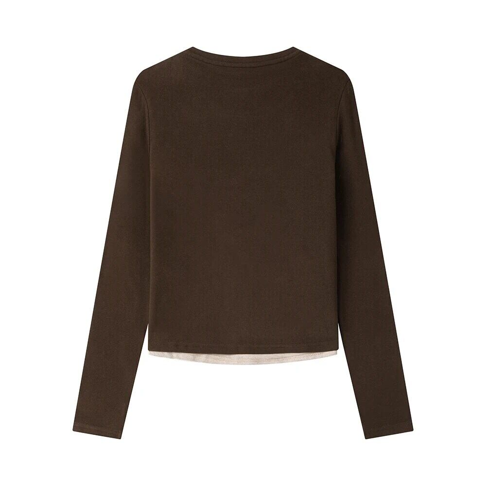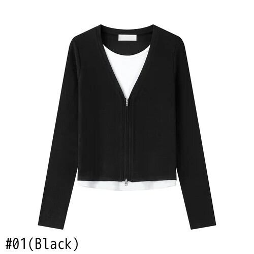 甘いホットガール V ネック偽ツーピース Tシャツ秋と冬スリムフィット長袖ジッパートップ ロング 大人ガーリー スウィート キュート カジュアル オータム 秋物 ウィンター 冬物 Vネック