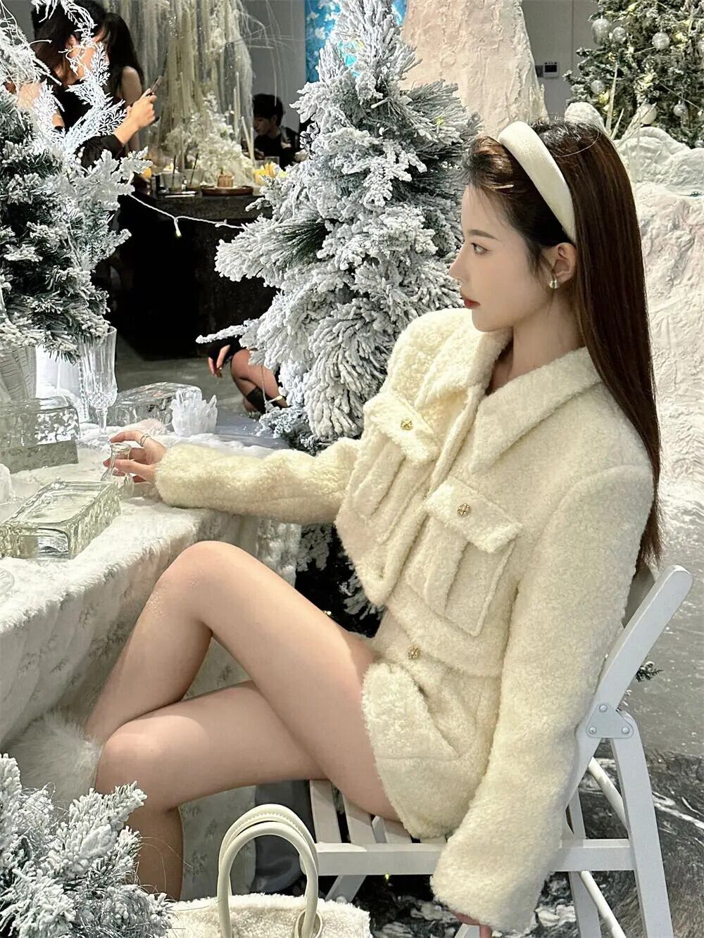 甘いホットガールスーツ冬ターンダウン襟ぬいぐるみジャケットウエストショートパンツ 2 点セット 大人ガーリー スウィート キュート カジュアル ウィンター 冬物