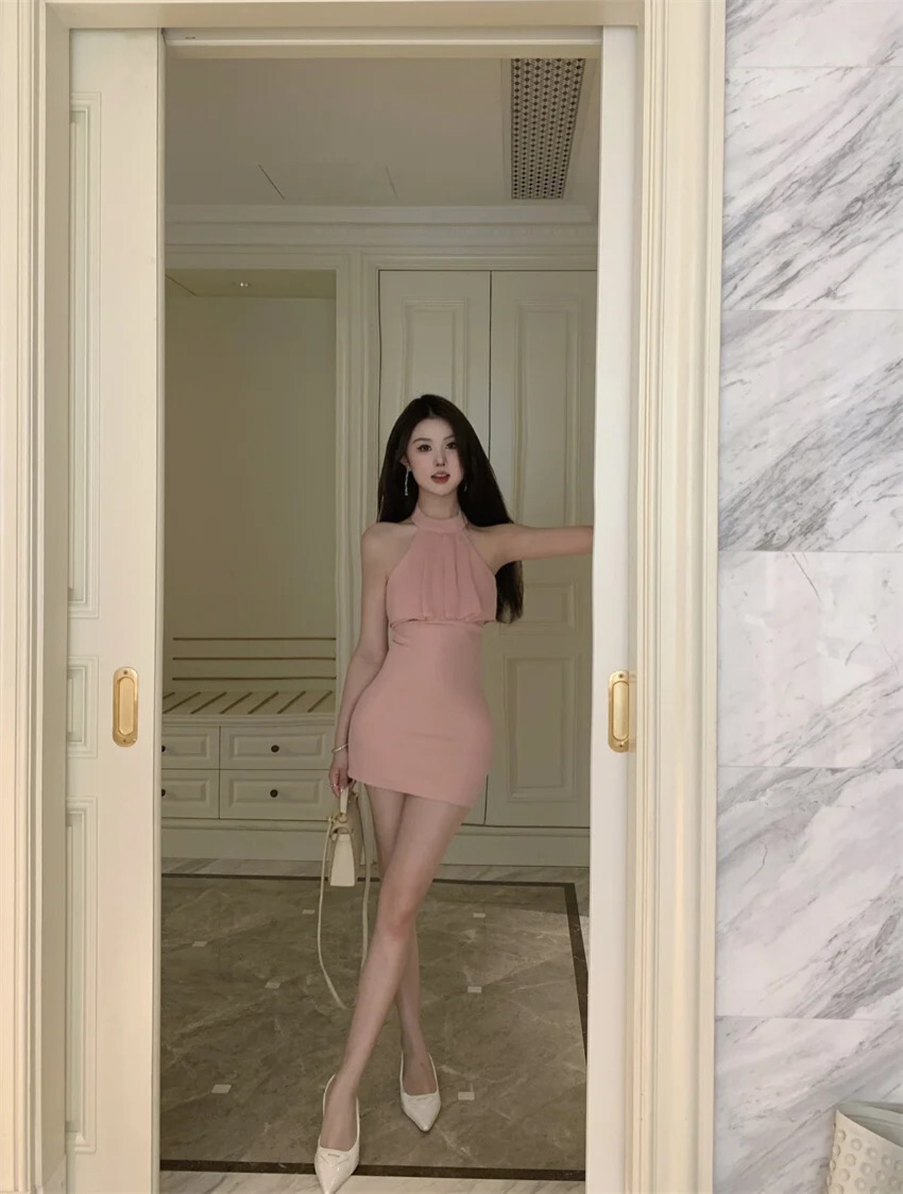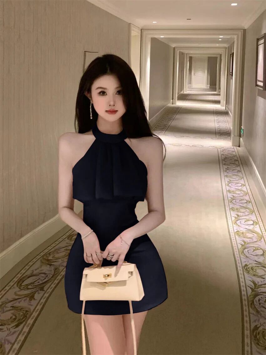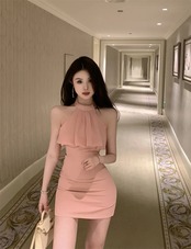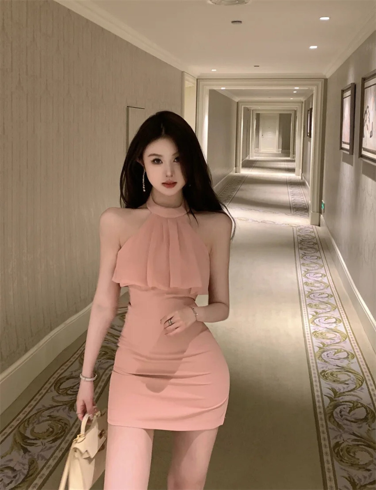 甘いホットガール純粋セクシーホルターネックドレスフリルエッジラップ尻スリムフィットショートドレス 大人ガーリー スウィート キュート カジュアル ピュア