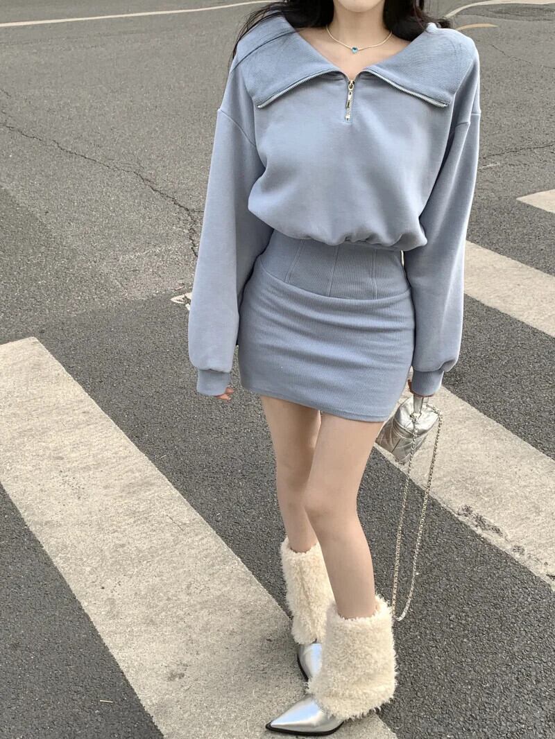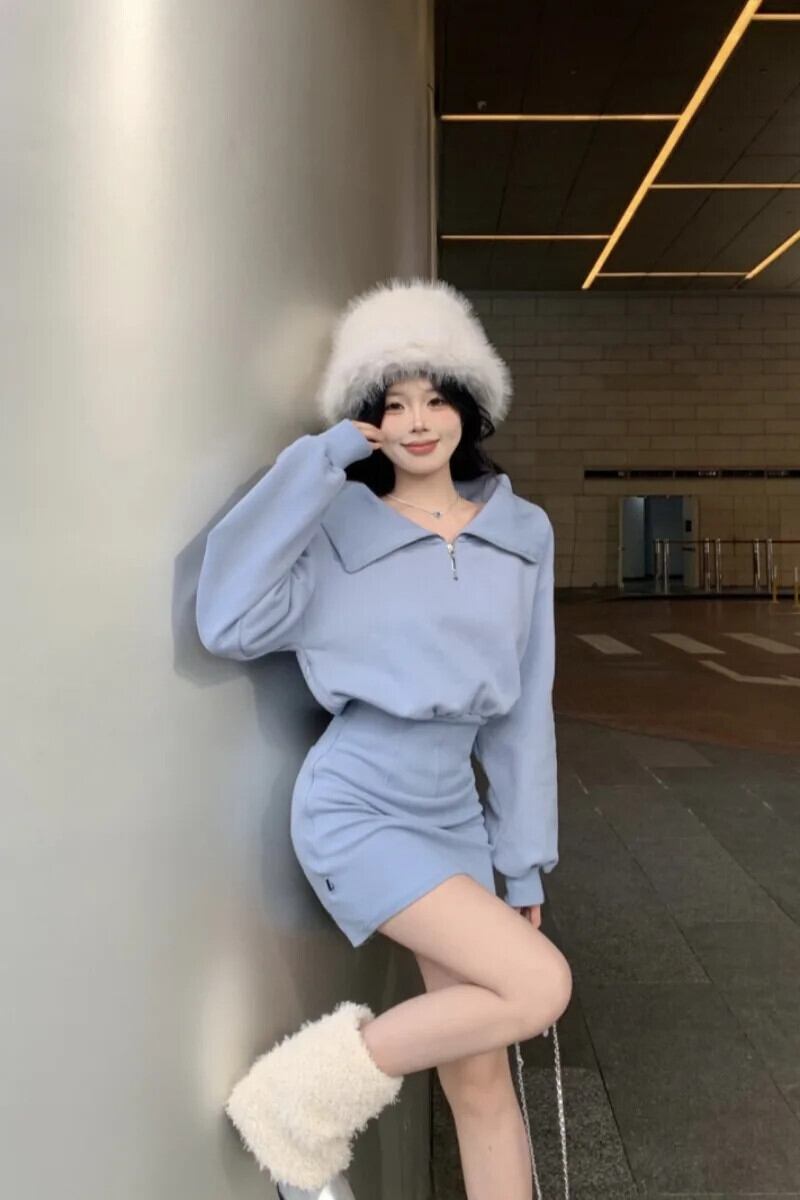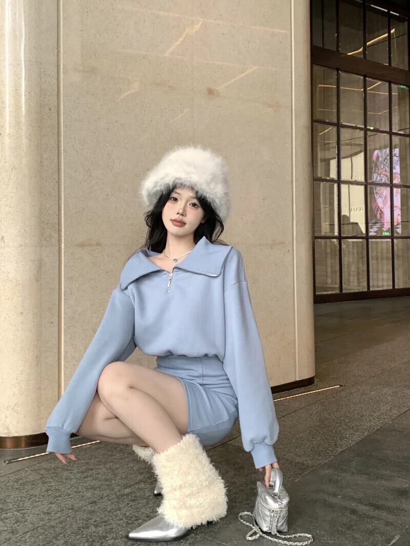 甘いホットガールブルーターンダウンカラードレス冬スリムフィットヒップラップショートドレス 大人ガーリー スウィート キュート カジュアル ウィンター 冬物