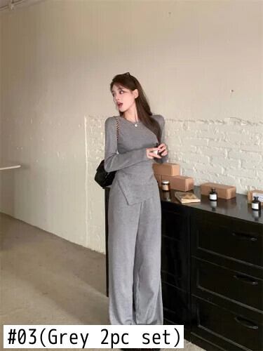 ホットガールスーツ秋不規則 O ネック長袖スリムフィット弾性ウエストワイドレッグパンツ 2 点セット ロング エラスティック 伸縮 オータム 秋物 Oネック ワイドパンツ