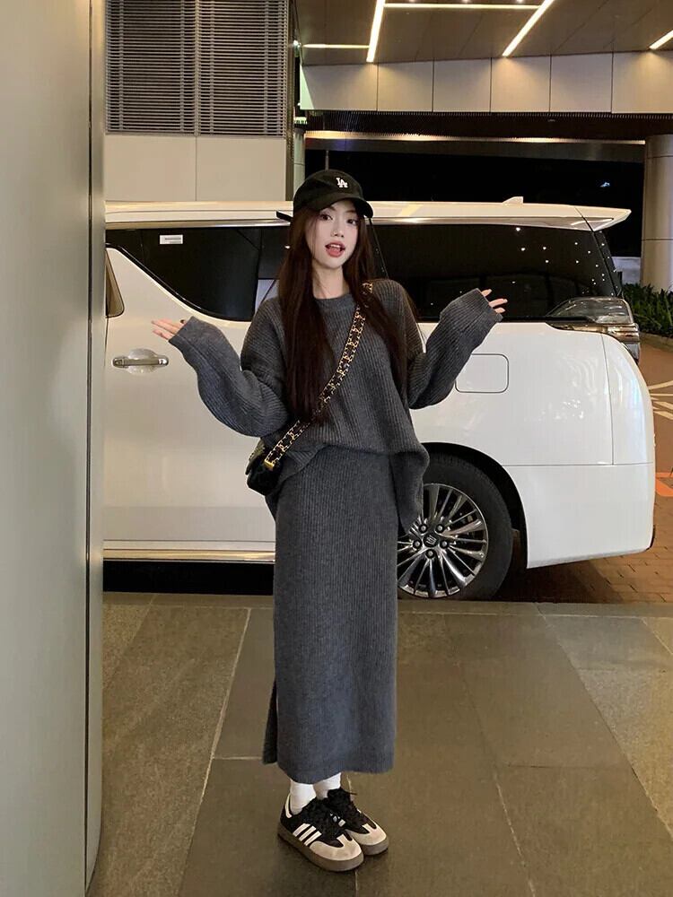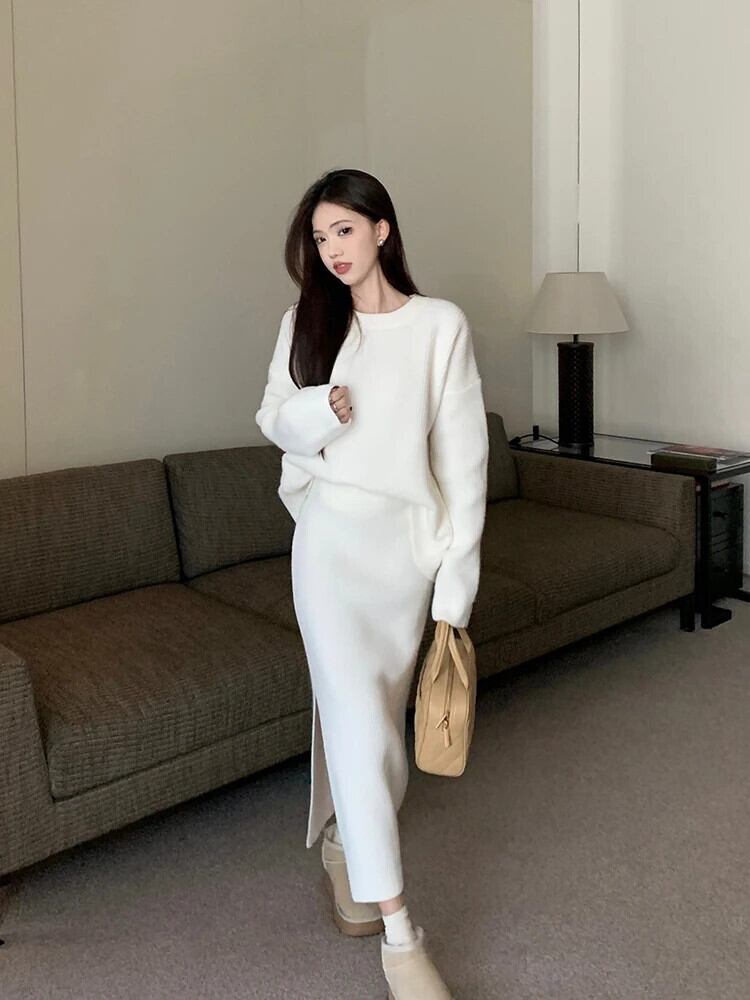 Sweet Girl ニットスーツ冬スプリット O ネックセーターウエストストレートロングスカート 2 点セット 大人ガーリー スウィート キュート カジュアル ウィンター 冬物 Oネック