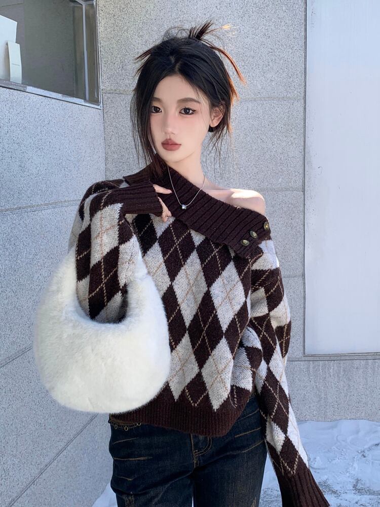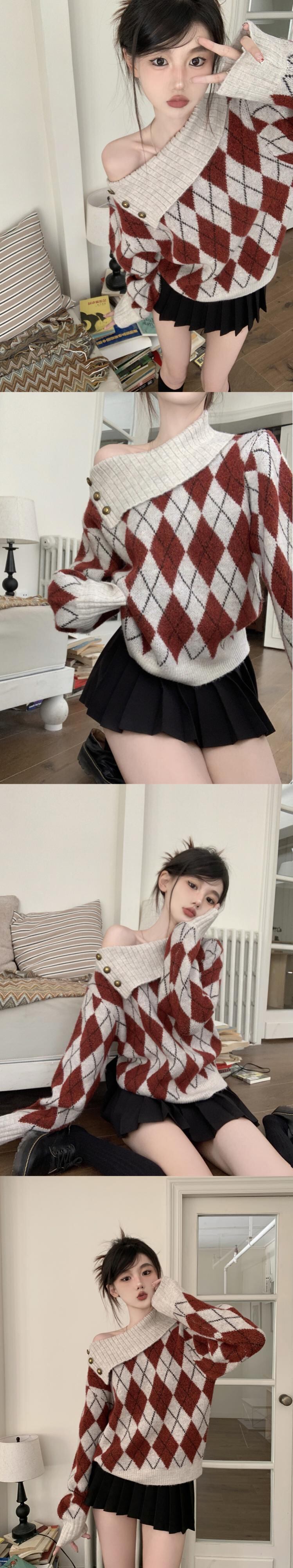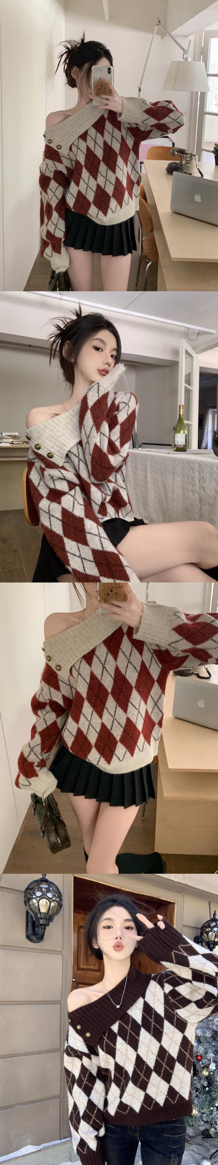 甘いホットガールラペルボタン菱形セーター秋/冬オフショルダージャカードショートニットプルオーバー 大人ガーリー スウィート キュート カジュアル オータム 秋物 ウィンター 冬物