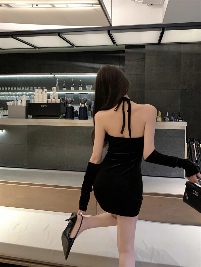 甘いホットガールセクシースプライシングホルターネックドレス秋/冬ベルベットスリムフィットボトムラップヒップショートドレス 大人ガーリー スウィート キュート カジュアル オータム 秋物 ウィンター 冬物