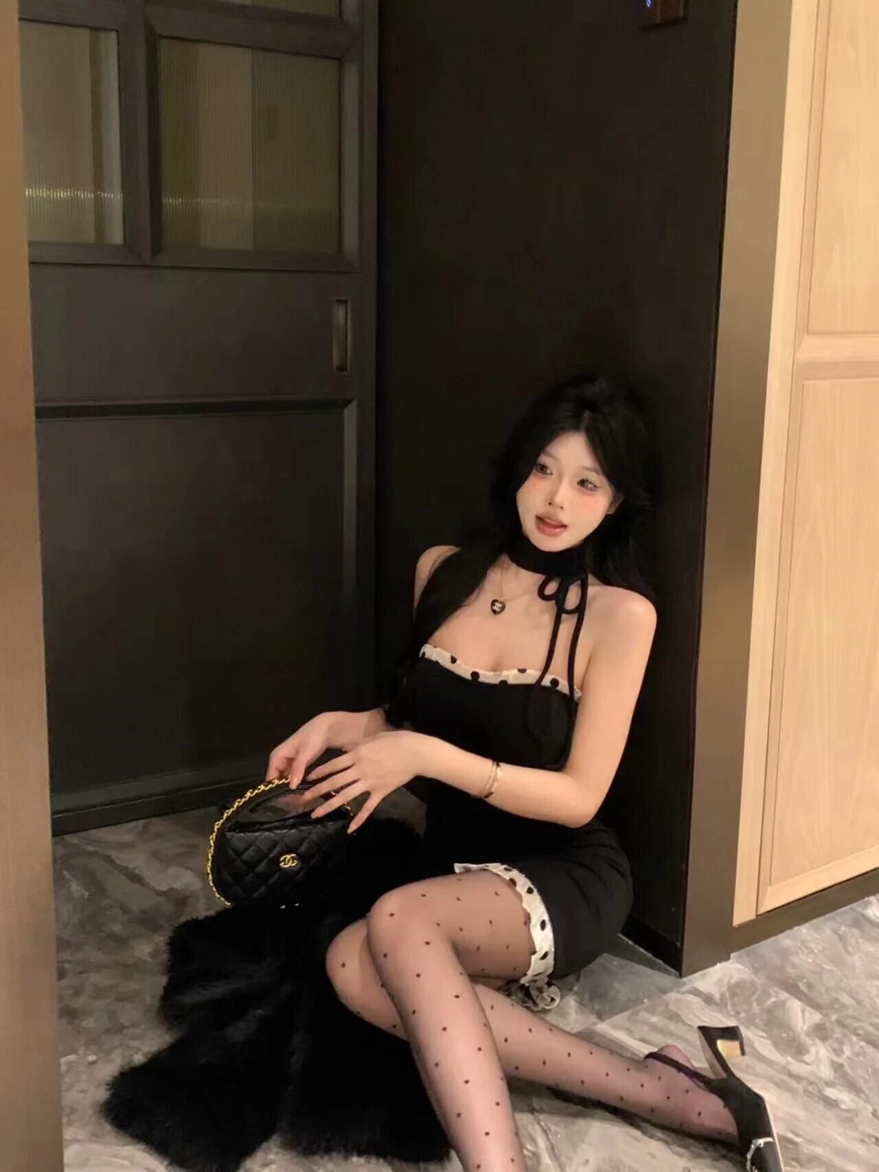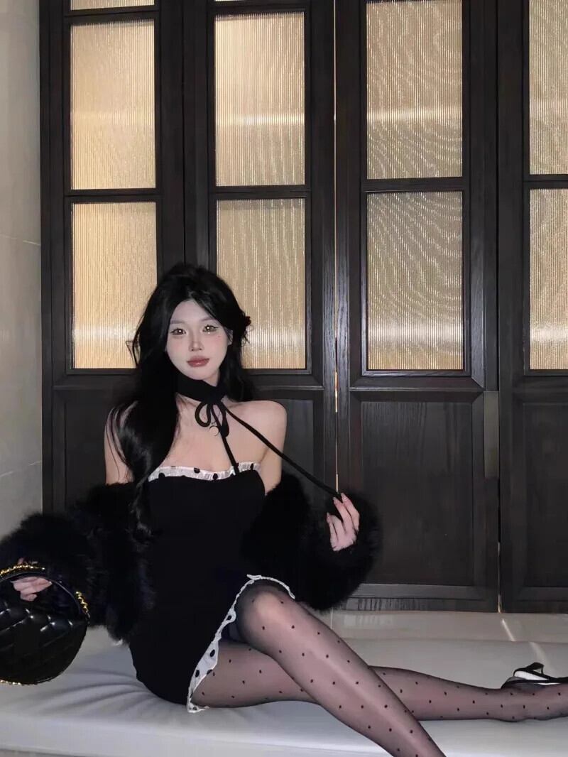 甘いホットガール純粋セクシーストラップレスドレス冬スリムフィットパッチワーク水玉メッシュブラックドレス 大人ガーリー スウィート キュート カジュアル ウィンター 冬物 ピュア