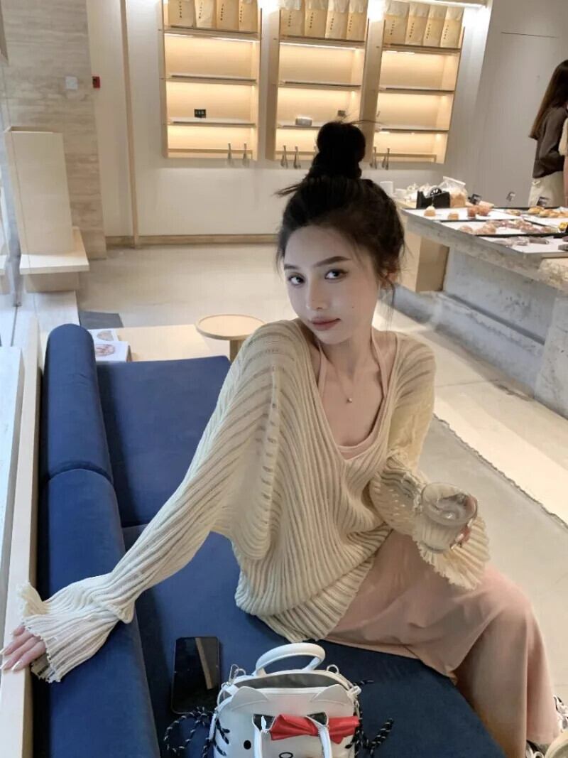 甘いホットガールスーツ春ルーズ V ネックニットトップセクシースリムフィットストラップロングドレス 2 点セット 大人ガーリー スウィート キュート カジュアル スプリング 春物 Vネック