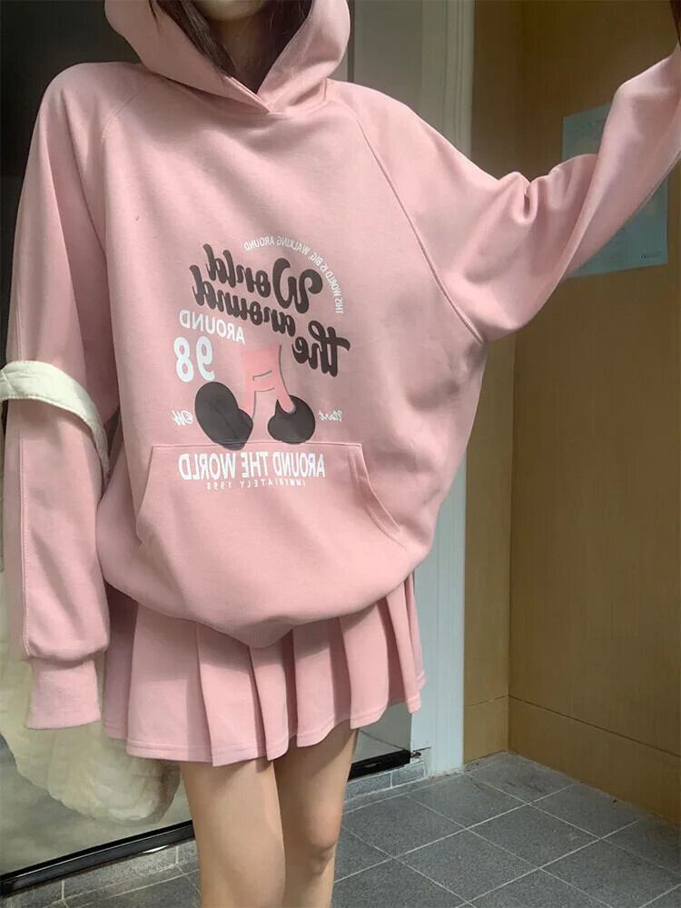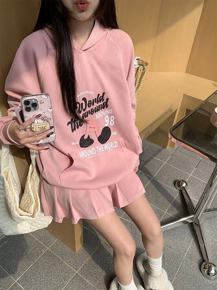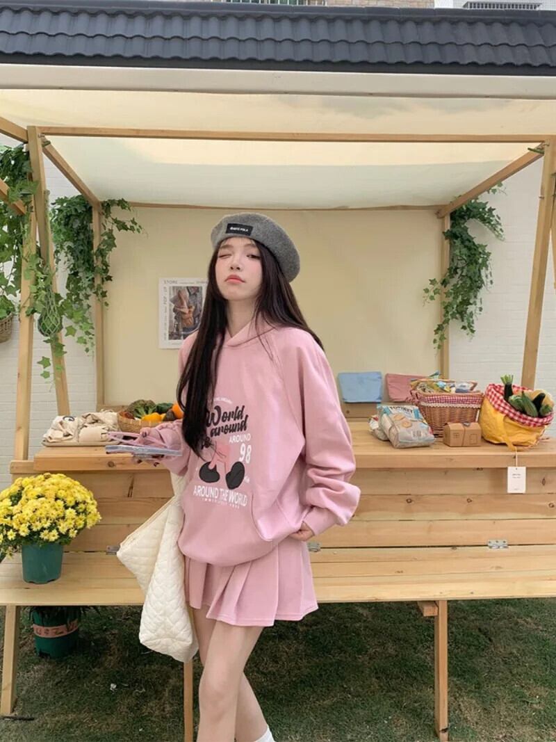 ホットガールピンクプリントスーツ春フード付きプルオーバー A ラインプリーツミニスカート 2 点セット Femlae スプリング 春物 Aライン