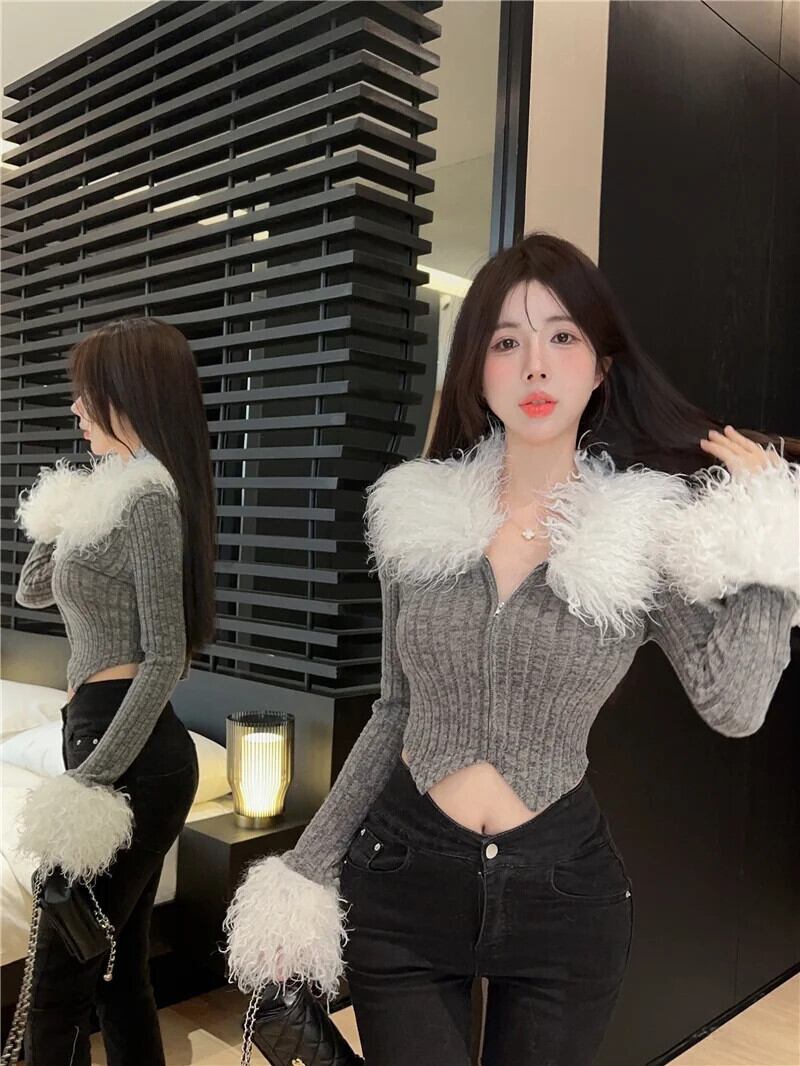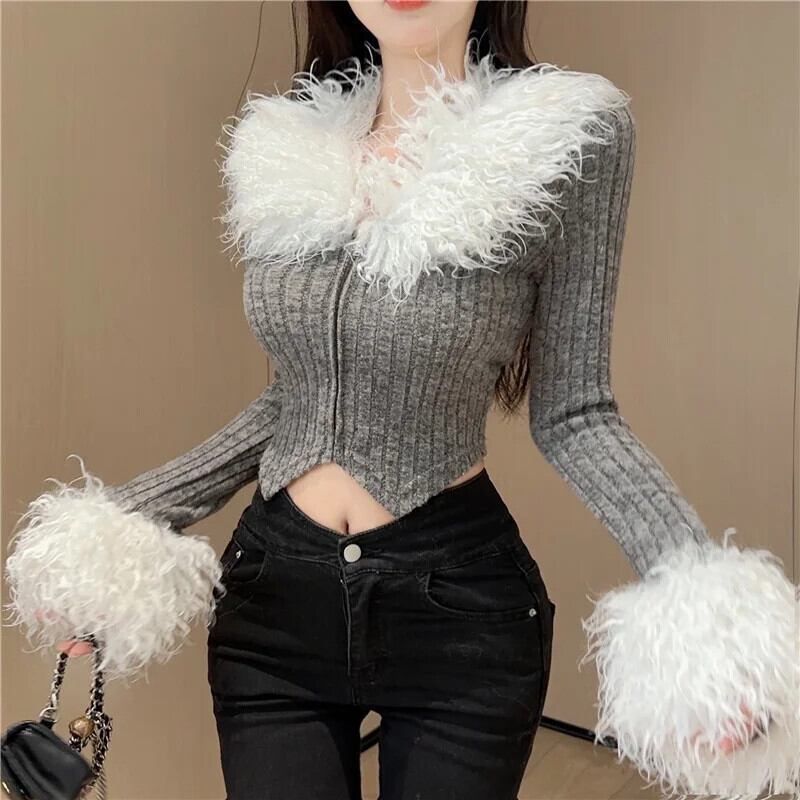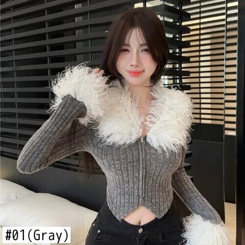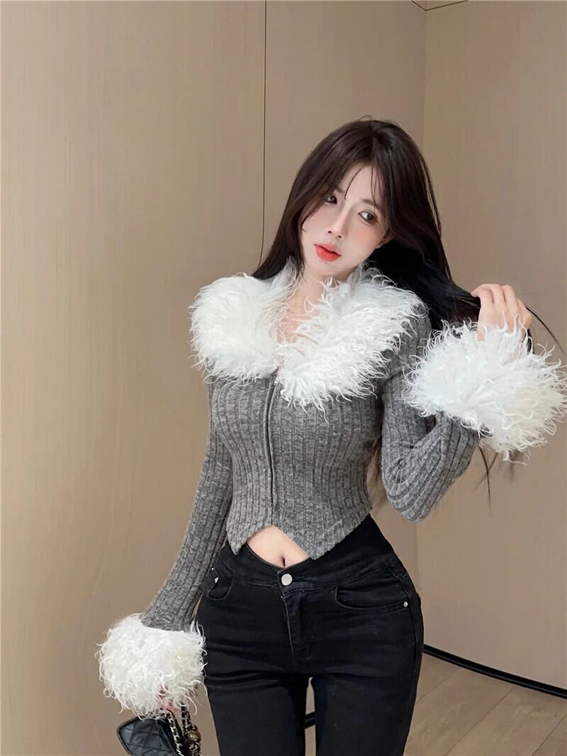 甘いホットガール毛皮襟ニットカーディガン冬ショートスリムフィット長袖不規則セーター ロング 大人ガーリー スウィート キュート カジュアル ウィンター 冬物