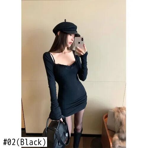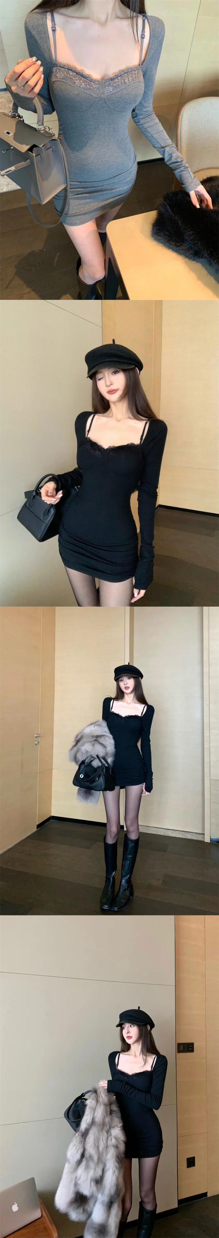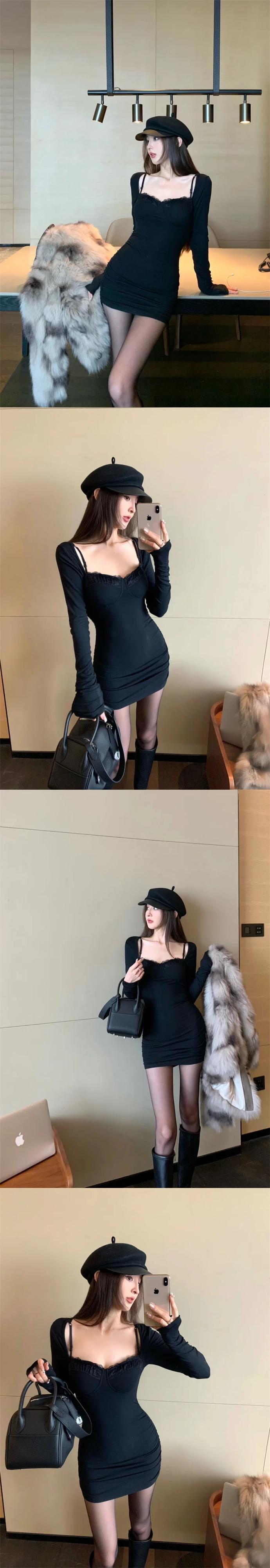 甘いホットガール純粋セクシーレースパッチワークヒップラップドレス冬胸パッドスクエアカラー長袖スリムフィットショートドレス ロング 大人ガーリー スウィート キュート カジュアル ウィンター 冬物 ピュア スクウェア