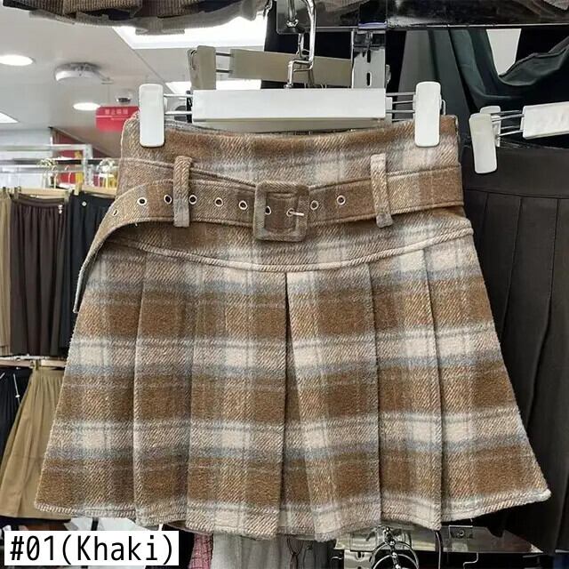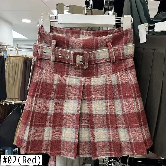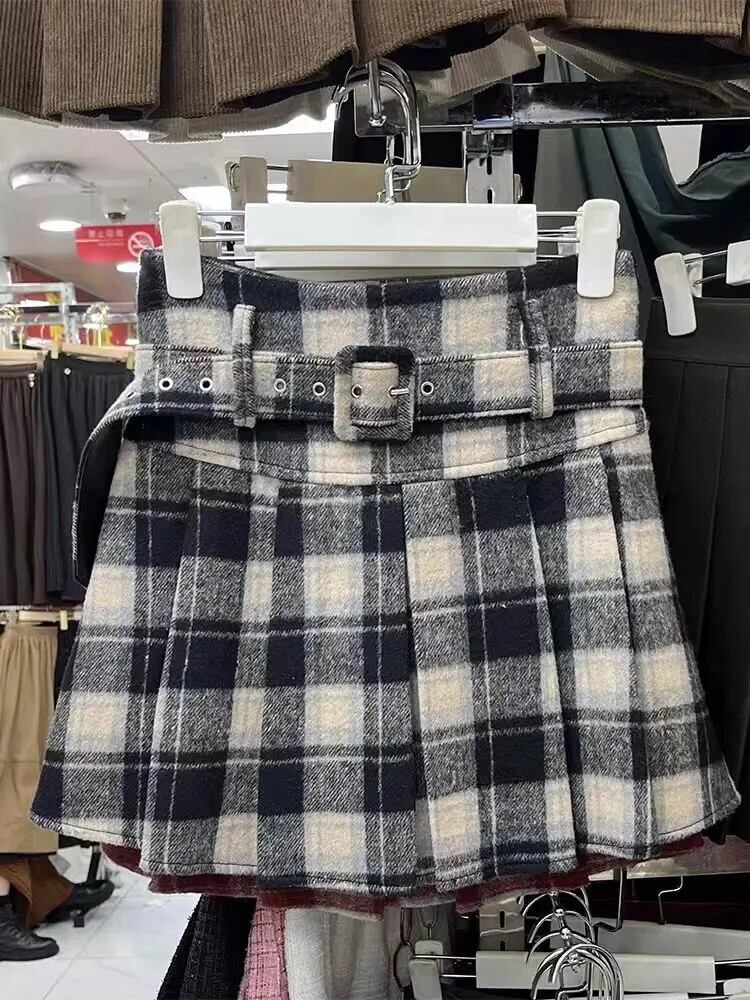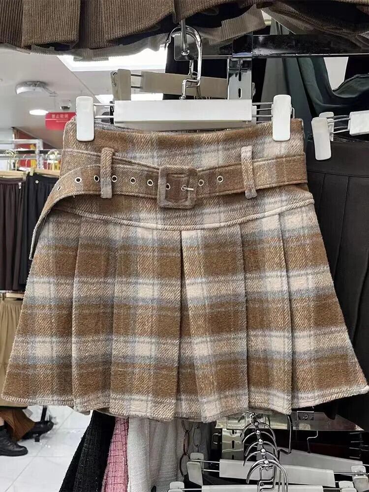 甘いホットガールウエストチェック柄ウールミニスカートレディース秋冬スタイル A ラインプリーツショートスカート 大人ガーリー スウィート キュート カジュアル オータム 秋物 ウィンター 冬物 Aライン