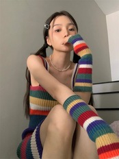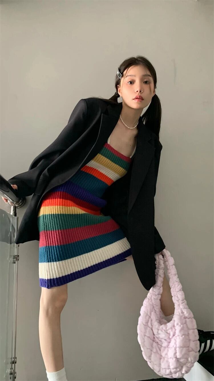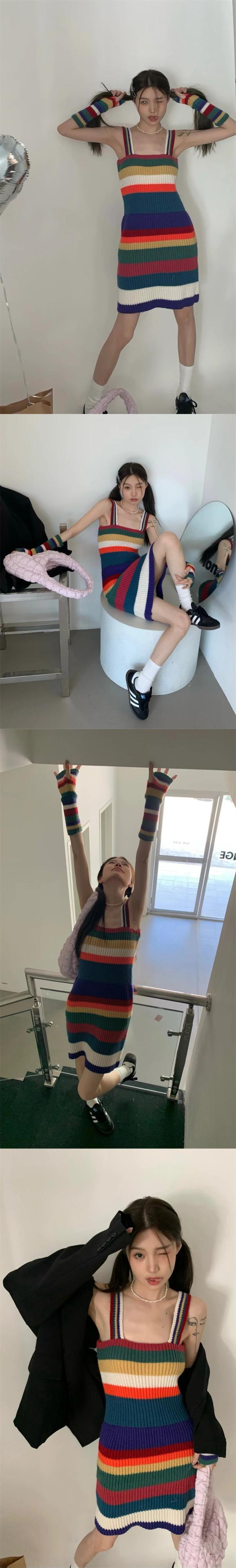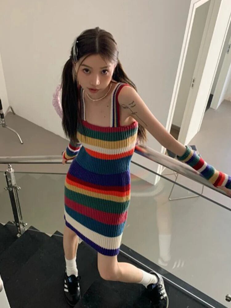 甘いホットガールカラフルストライプニットストラップドレス春スリムラップヒップ膝丈ショートドレス 大人ガーリー スウィート キュート カジュアル スプリング 春物