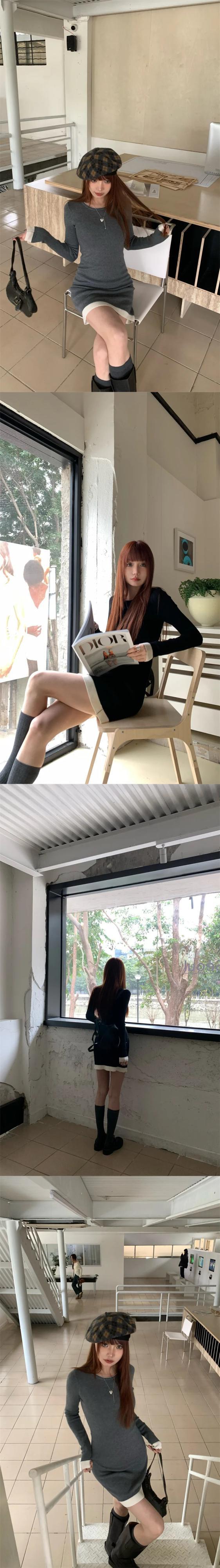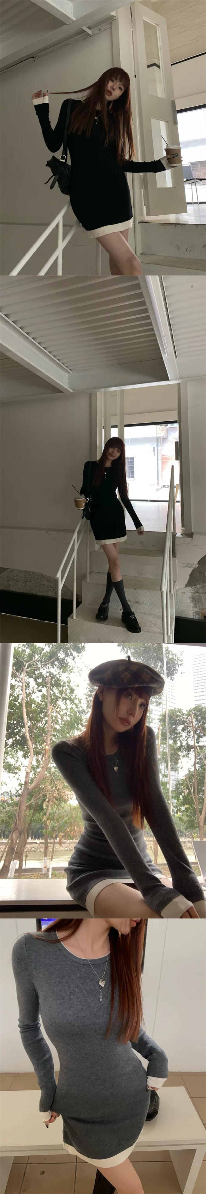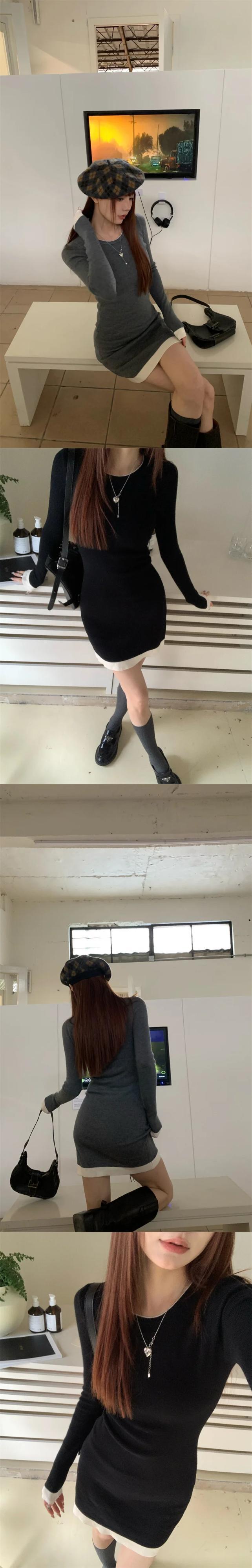甘いホットガールパッチワーク長袖ドレス冬 O ネックスリムラップヒップニットショートドレス ロング 大人ガーリー スウィート キュート カジュアル ウィンター 冬物 Oネック