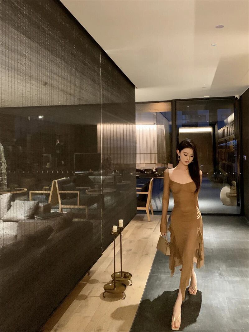 甘いホットガールスクエアカラーパープルメッシュセクシードレス秋と冬スリムフィットフリルロングドレス 大人ガーリー スウィート キュート カジュアル オータム 秋物 ウィンター 冬物 スクウェア