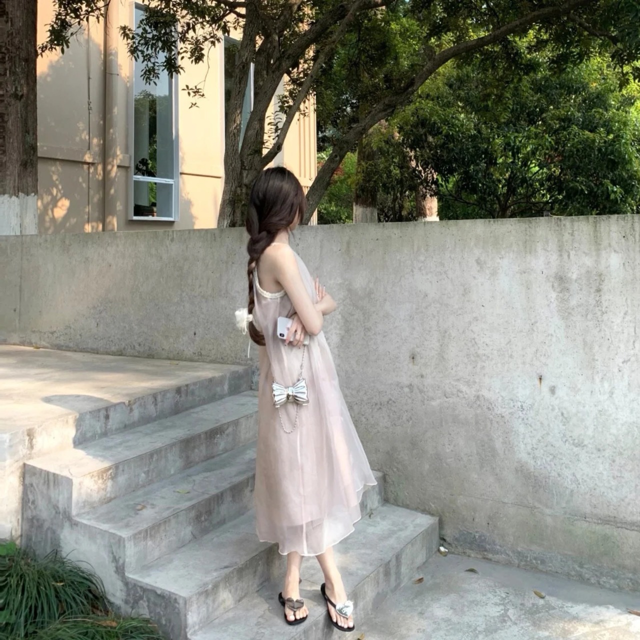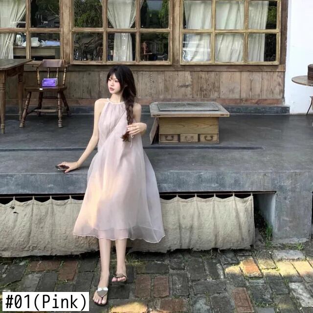 フレンチスイートホットガールピンクホルターネックドレス春ルーズミッドレングス妖精Aラインドレス 大人ガーリー スウィート キュート カジュアル スプリング 春物