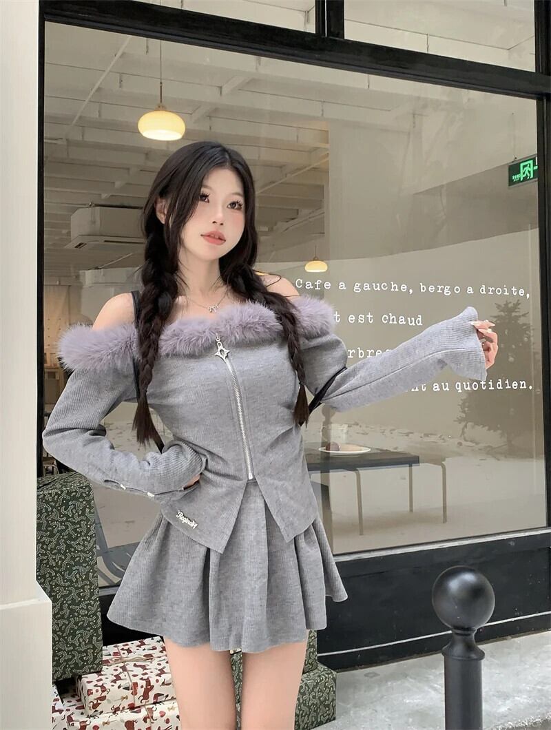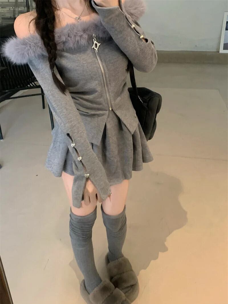 甘いホットガール純粋セクシースーツ春毛皮襟オフショルダーニットセーター A ラインミニスカート 2 点セット 大人ガーリー スウィート キュート カジュアル スプリング 春物 Aライン ピュア