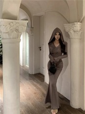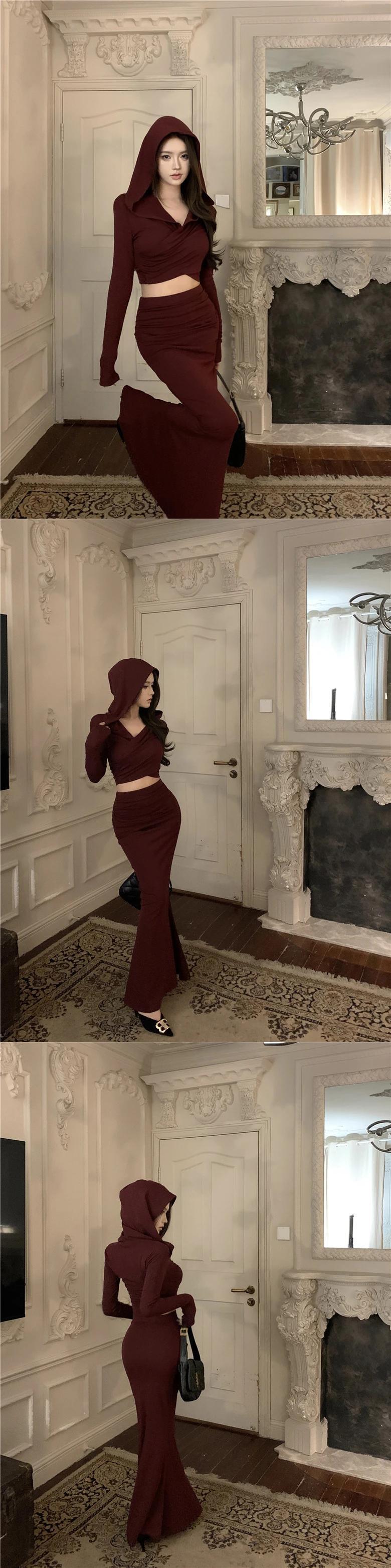 アメリカンホットガールスーツ秋/冬セクシー長袖フード付きTシャツウエストマーメイドスカート2点セット ロング オータム 秋物 ウィンター 冬物