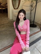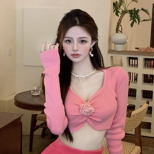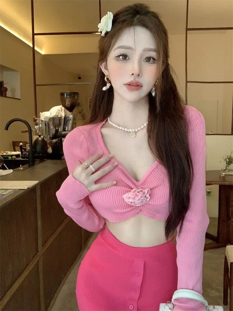 純粋セクシー甘いホットガールスーツ秋ニットルーズブロッサムショートトップウエストラップヒップスカートツーピースセット 大人ガーリー スウィート キュート カジュアル オータム 秋物