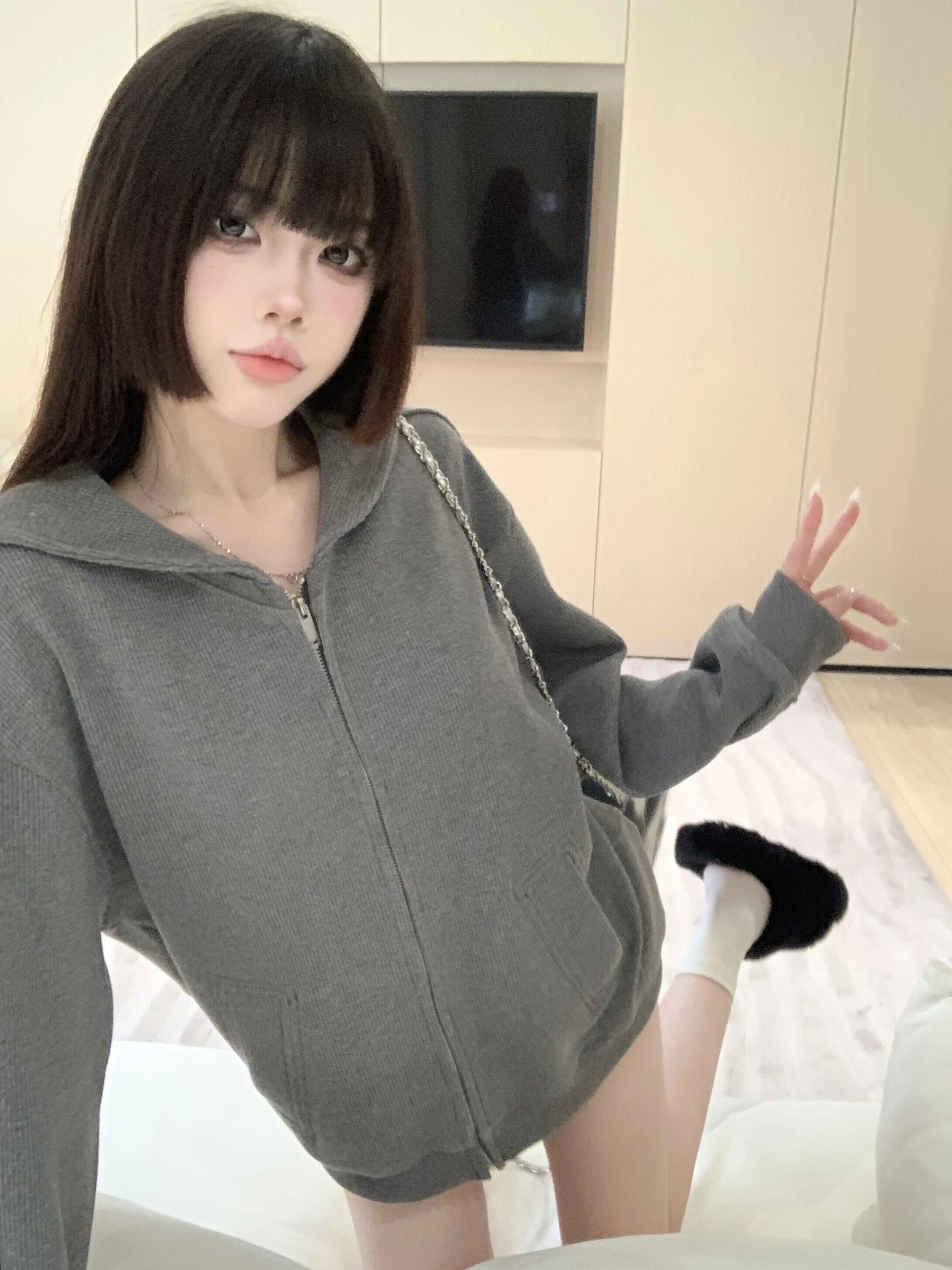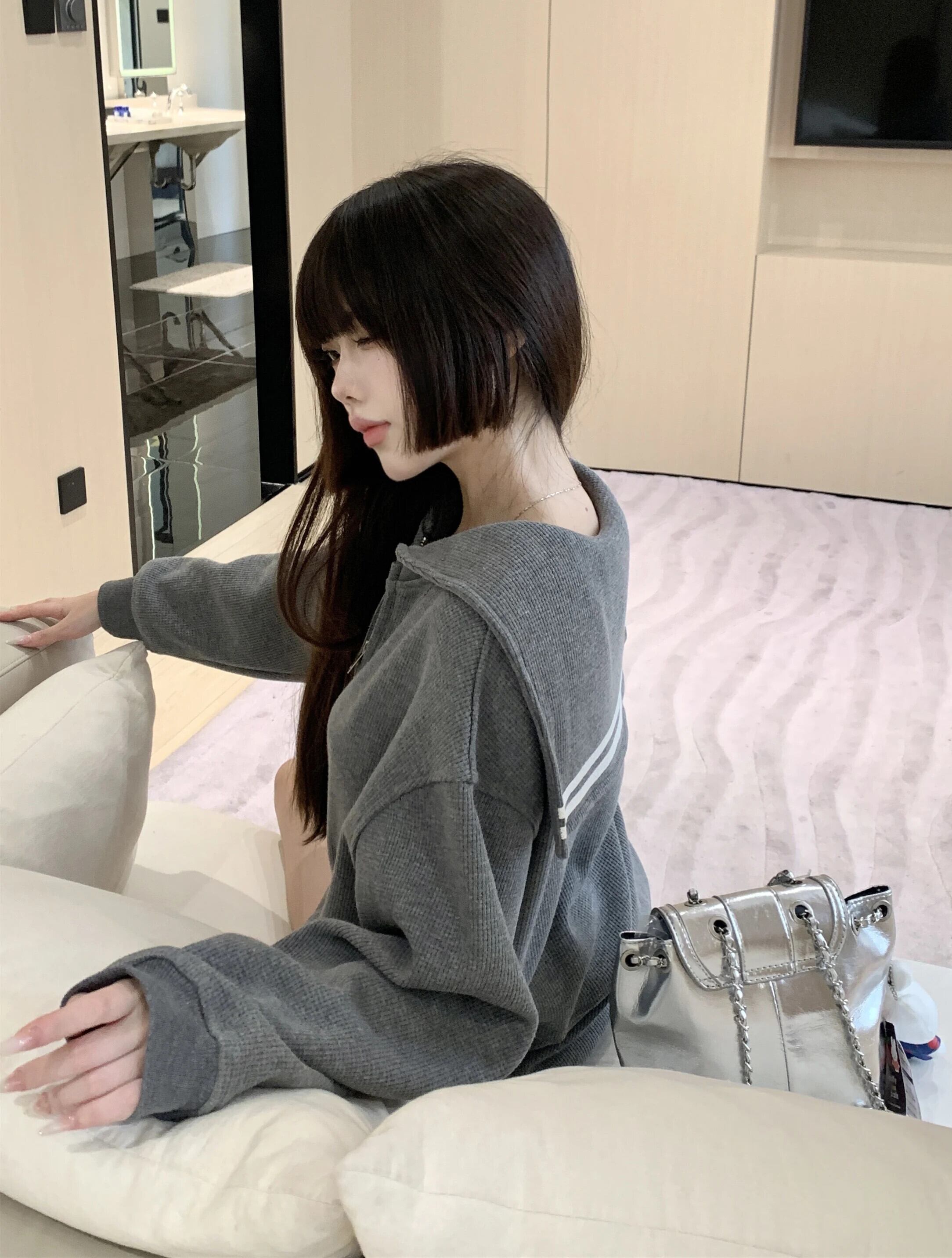 スウィートガールグレーセーラー襟ワッフルトレーナージッパーコート秋ルーズ長袖カーディガントップ ロング 大人ガーリー キュート カジュアル オータム 秋物