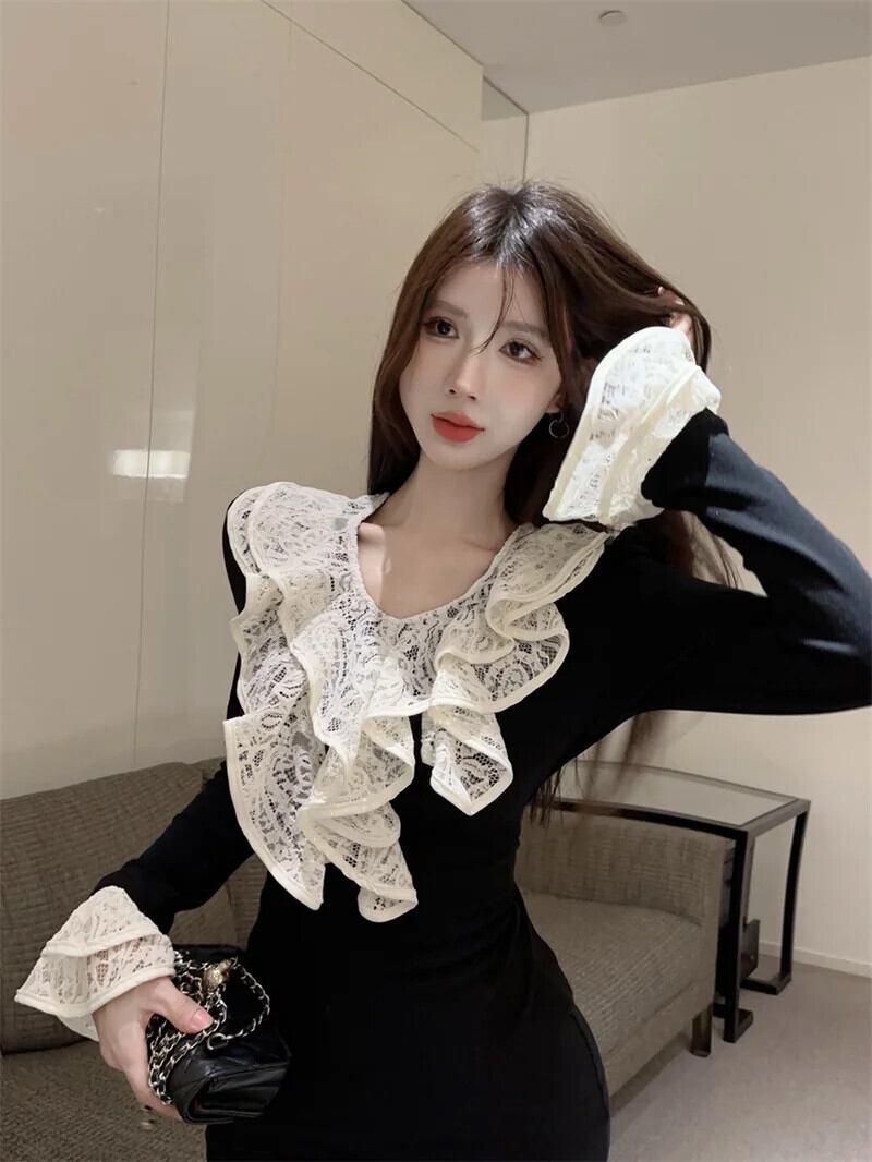 フレンチホットガールレトロ V ネック長袖レースドレス秋パッチワークスリムショートドレス ロング オータム 秋物 Vネック