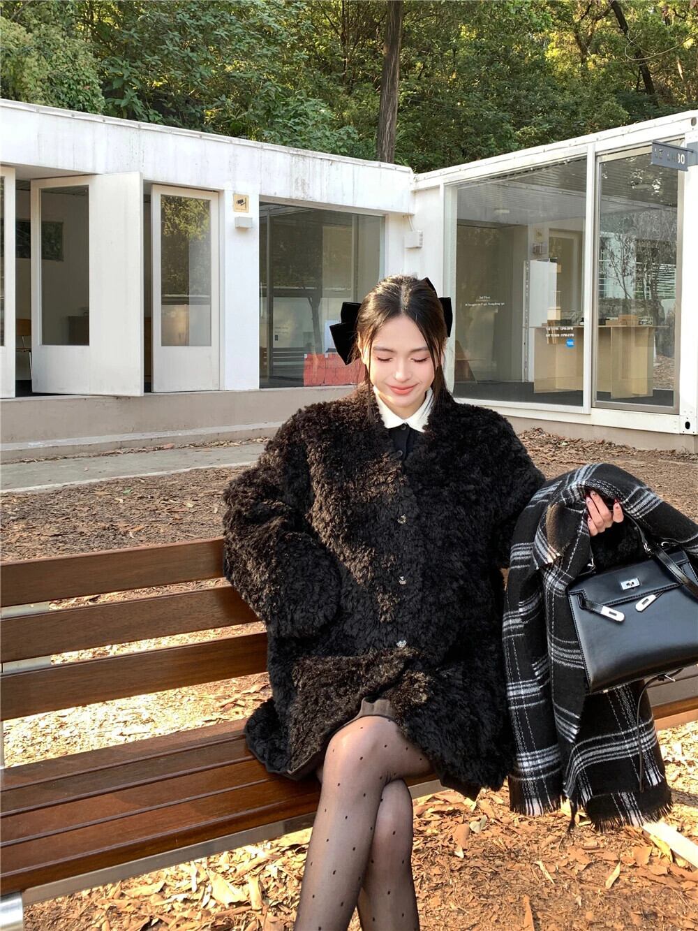 甘いホットガール黒 V ネックラムウールコート冬厚さルーズ長袖ミドル丈コート ロング ブラック 大人ガーリー スウィート キュート カジュアル ウィンター 冬物 Vネック