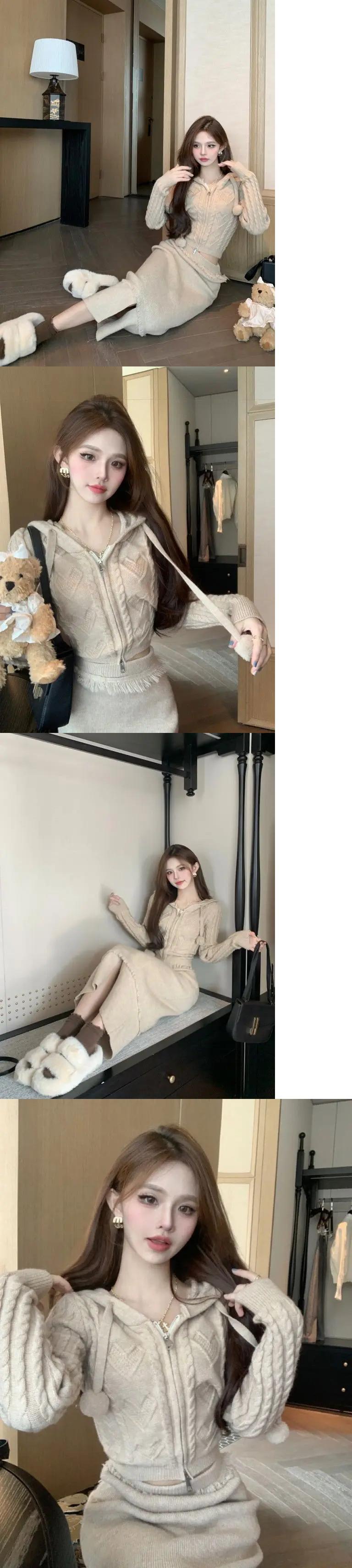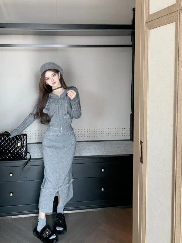甘いホットガールスーツ春ジッパー長袖フード付きセータースリムフィットウエストスカートツーピースセット ロング 大人ガーリー スウィート キュート カジュアル スプリング 春物