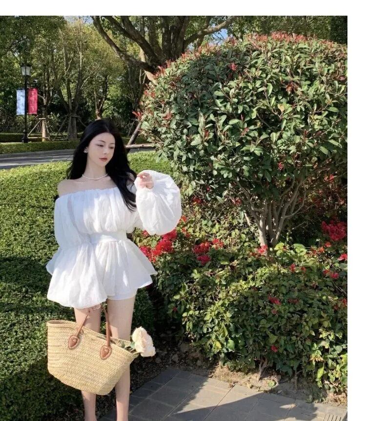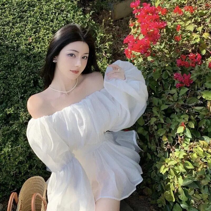 甘いホットガールセクシーオフショルダーメッシュシフォンシャツ春ルーズフィットバブルスリーブシャツ 大人ガーリー スウィート キュート カジュアル スプリング 春物