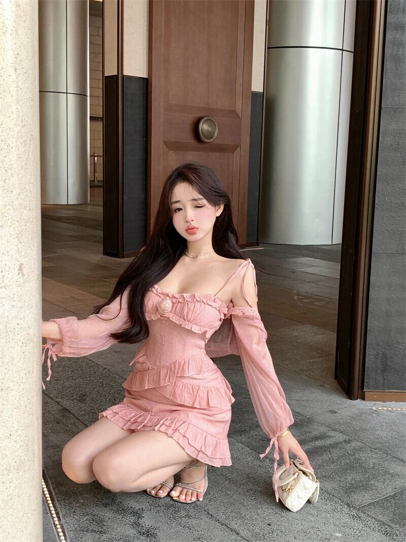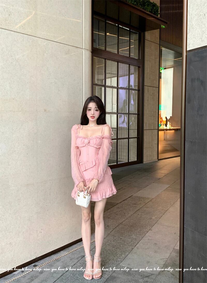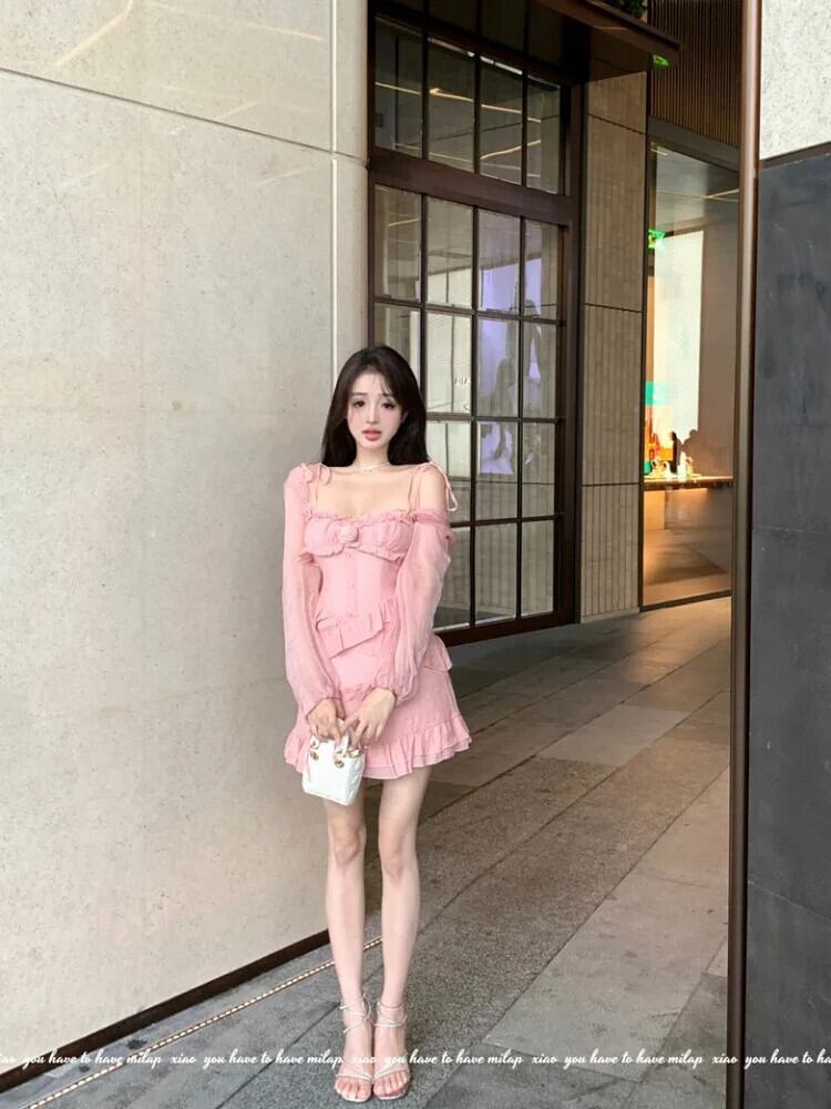 甘いホットガールスーツ春ピンクフリルストラップドレスシック長袖ショールカーディガントップツーピースセット ロング 大人ガーリー スウィート キュート カジュアル スプリング 春物
