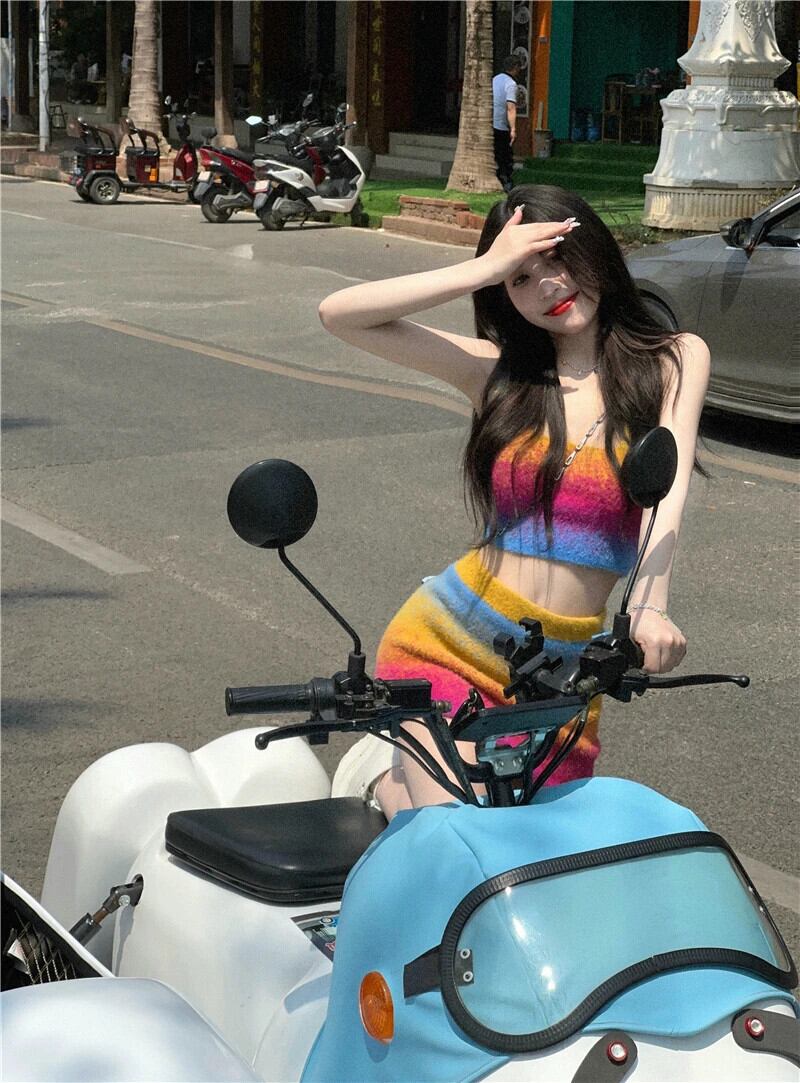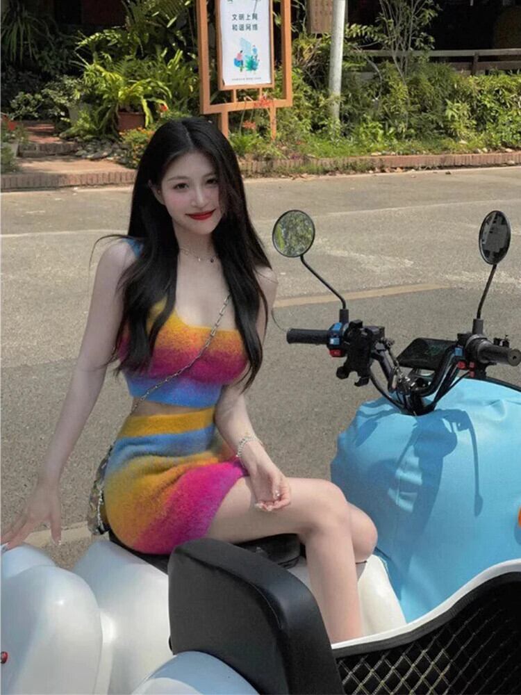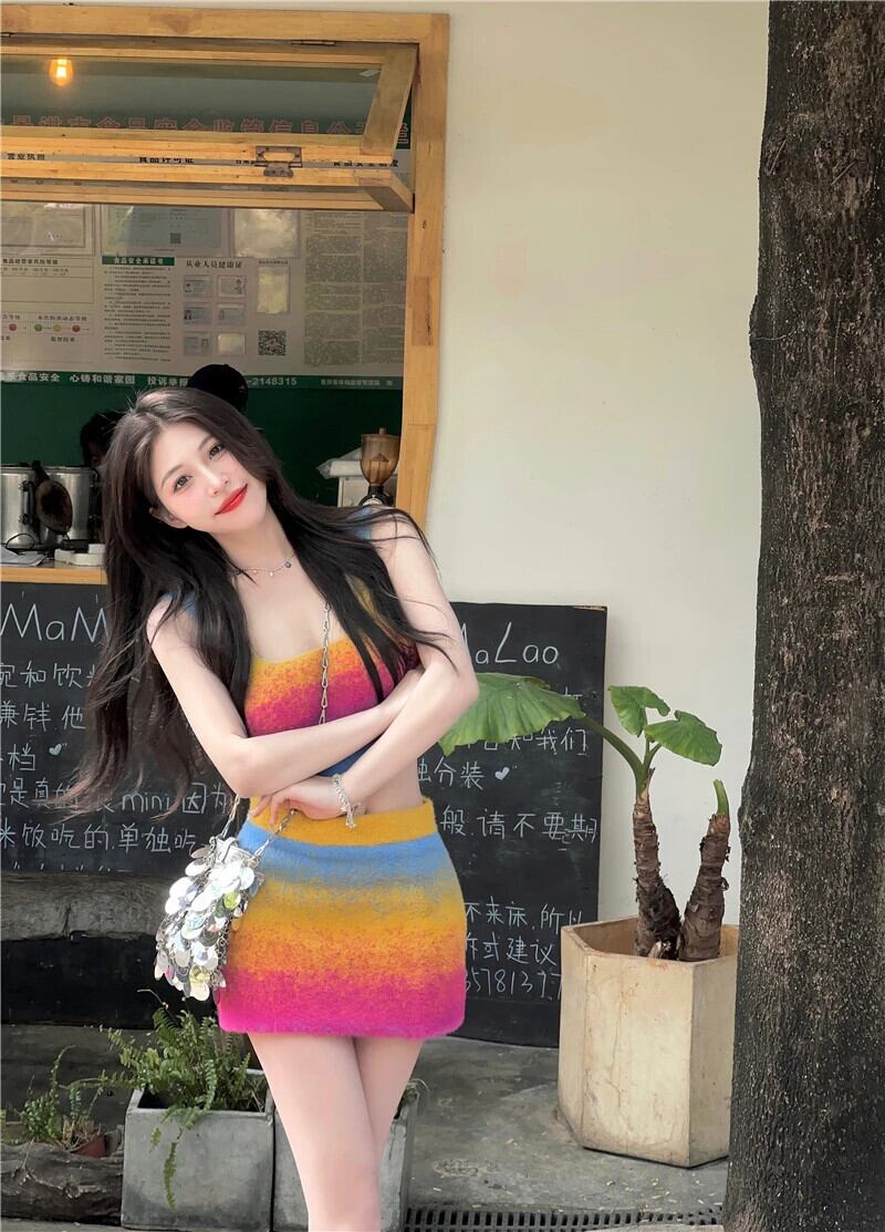 甘いホットガールズカラフルスーツ春ニットストラップタンクトップラップヒップショートスカートツーピースセット 大人ガーリー スウィート キュート カジュアル スプリング 春物
