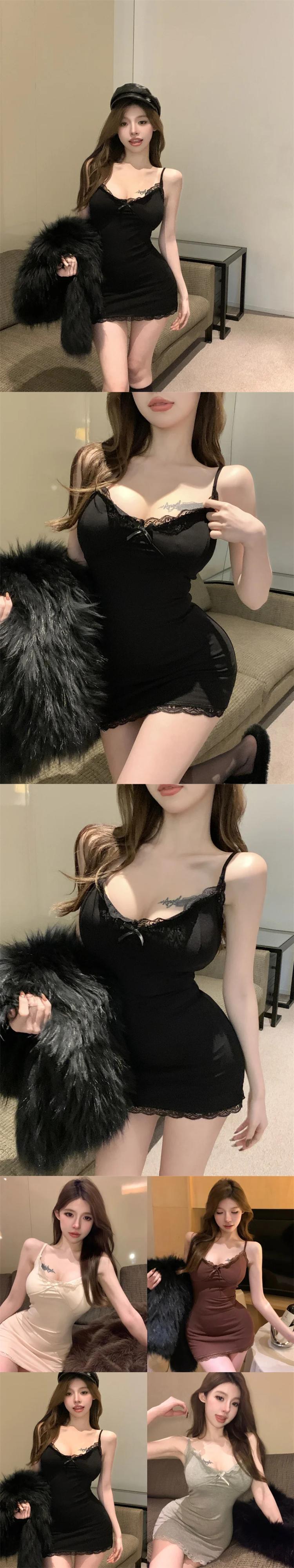 ホットガール純粋セクシーレースパッチワークストラップドレス冬弓スリムフィットノースリーブショートドレス リボン ウィンター 冬物 ピュア