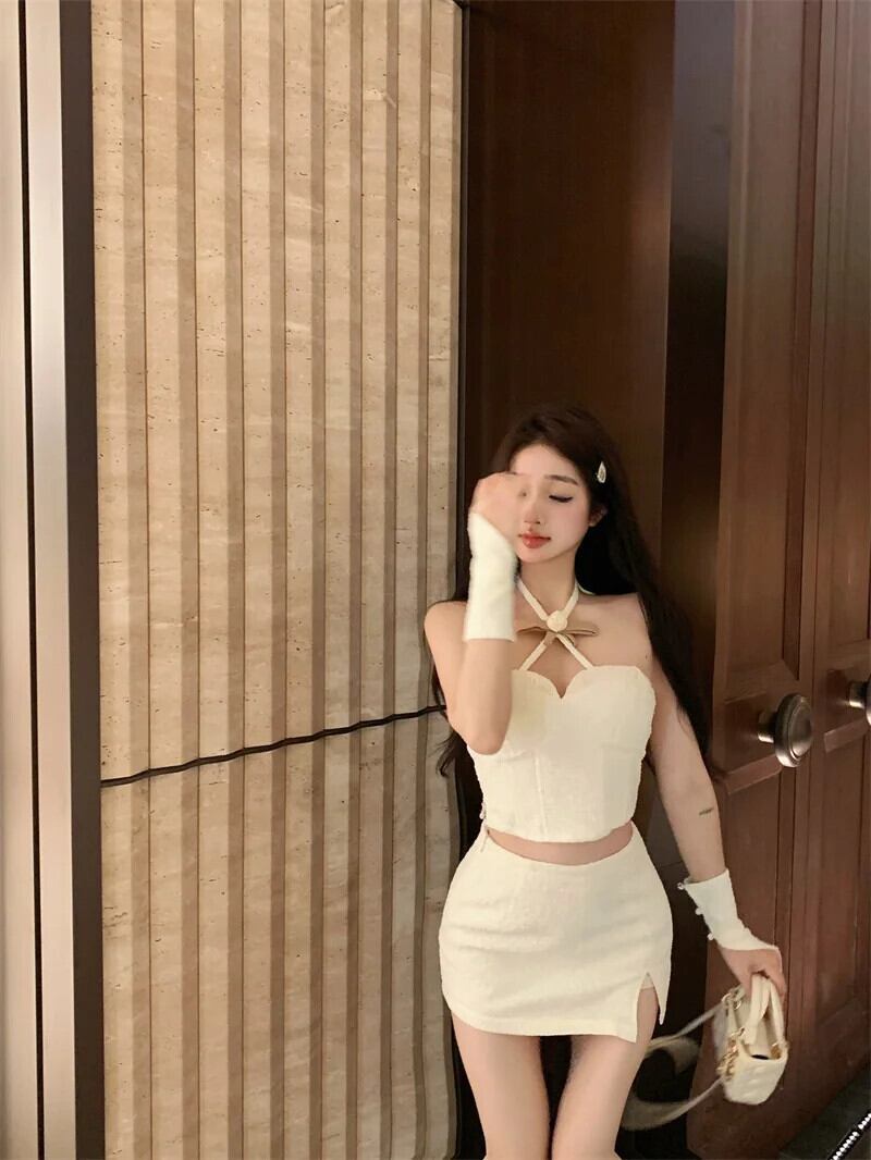甘いホットガールスーツ春スリムフィットホルターネックタンクトップウエストラップヒップスカートツーピースセット 大人ガーリー スウィート キュート カジュアル スプリング 春物
