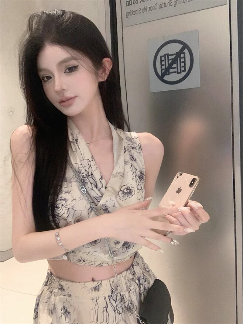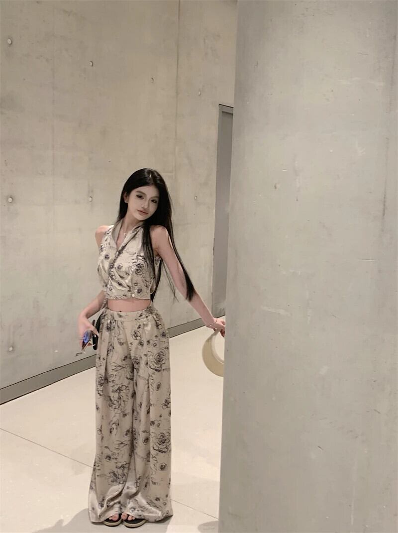甘いホットガールプリントスーツ春 V ネックノースリーブショートトップウエストパンツ 2 点セット 大人ガーリー スウィート キュート カジュアル スプリング 春物 Vネック