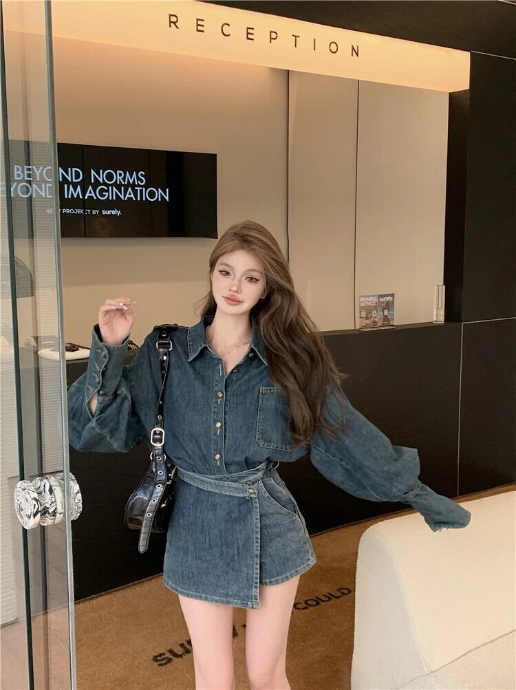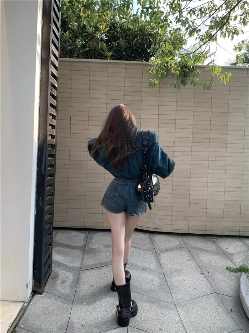アメリカンレトロスーツ冬ラペルデニムワークジャケットウエストショートスカートパンツツーピースセット ウィンター 冬物