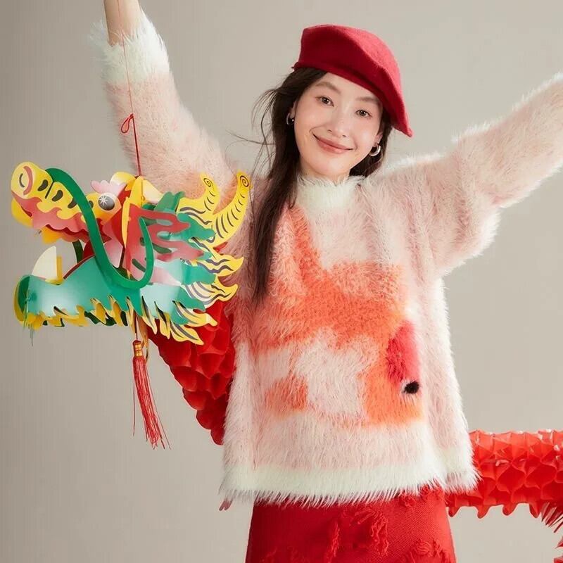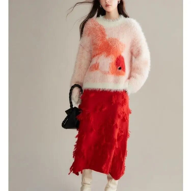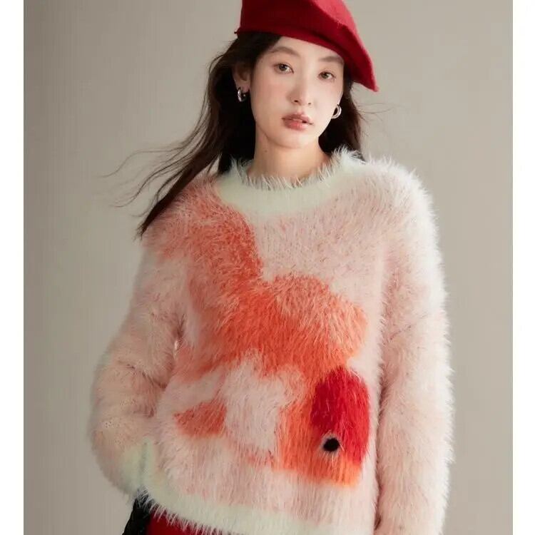 甘いホットガールプリント O ネックセーター春金魚イミテーションミンクルーズニットプルオーバー 大人ガーリー スウィート キュート カジュアル スプリング 春物 Oネック