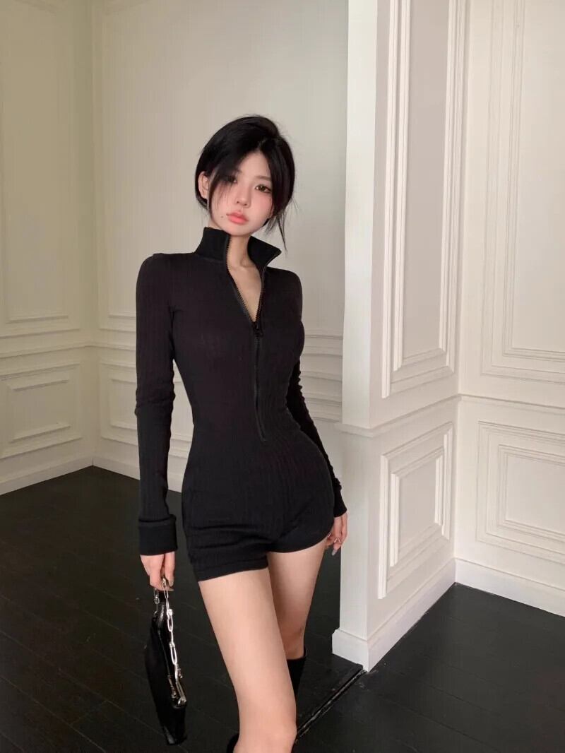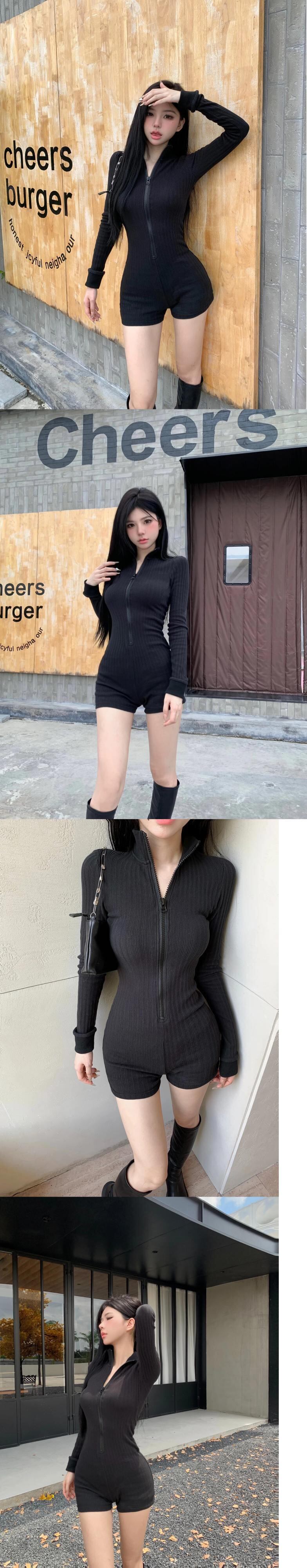 アメリカンホットガールジッパースリムフィット長袖ジャンプスーツショーツ春スタンドカラージャンプスーツ ロング スプリング 春物 ブルマー ソリッドカラー