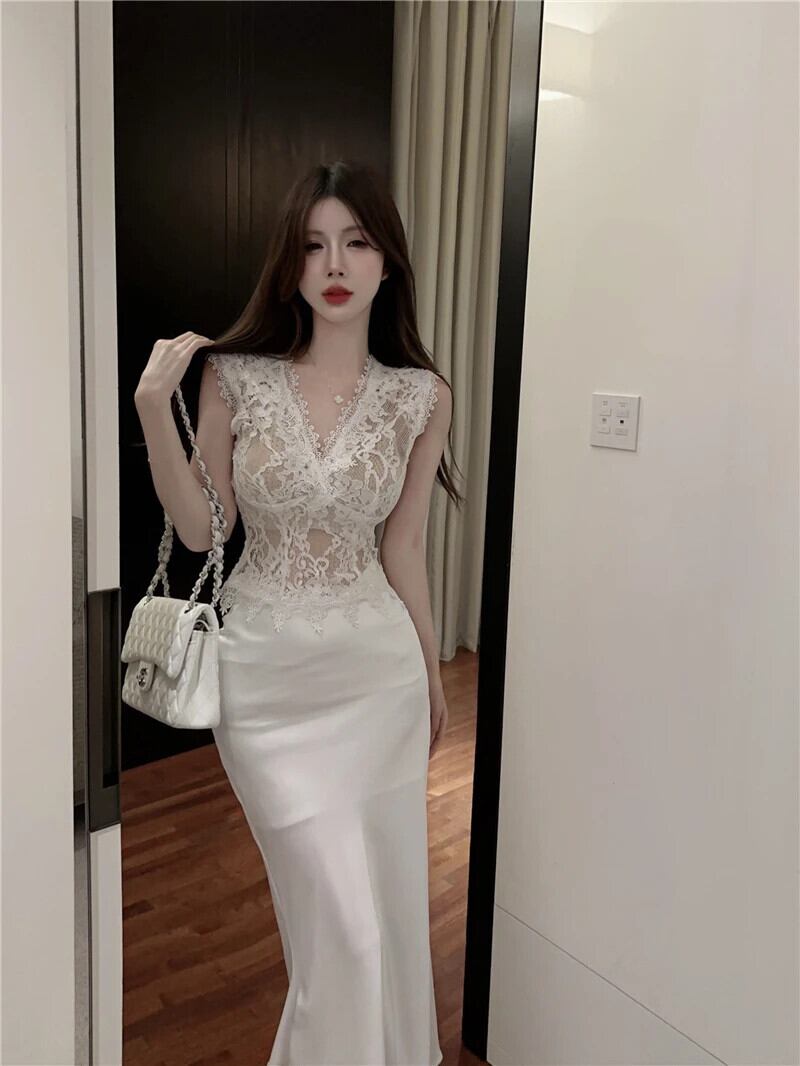 スイートホットガールスーツ春夏レースディープ V ネックノースリーブトップロングマーメイドスカート 2 点セット 大人ガーリー スウィート キュート カジュアル スプリング 春物 サマー 夏物 Vネック