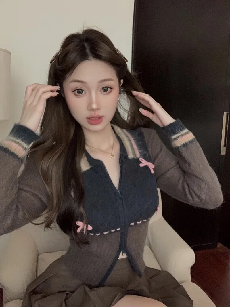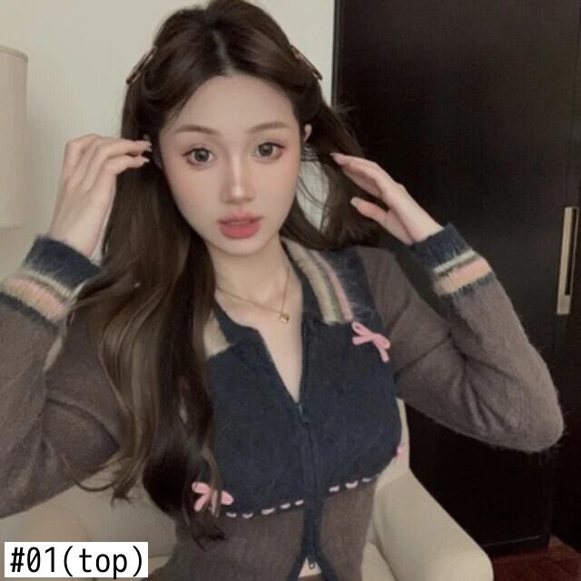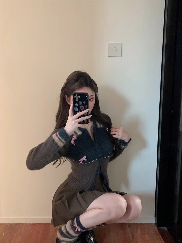 スイートホットガールスタイルスーツ秋ターンダウン襟リボンニットカーディガン A ラインプリーツショートスカート 2 点セット 大人ガーリー スウィート キュート カジュアル オータム 秋物 Aライン