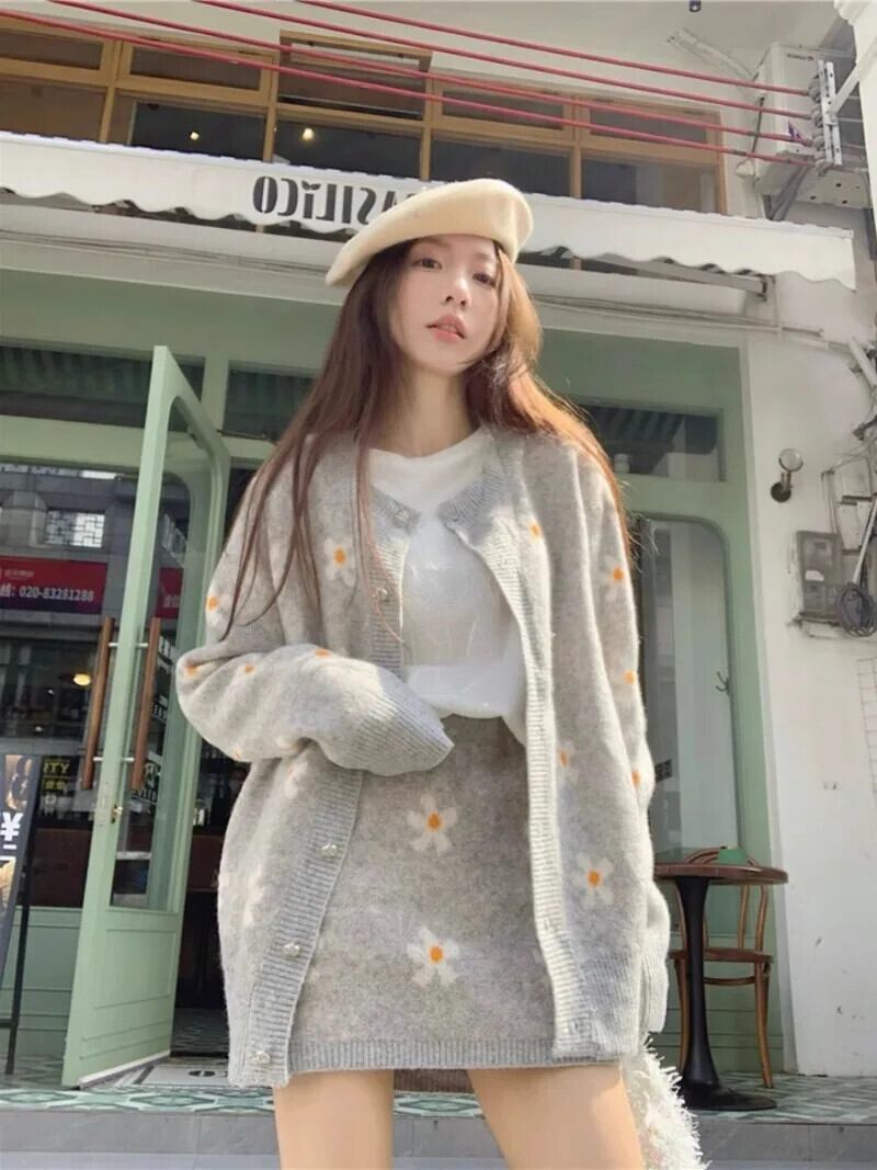甘いホットガールスーツ春 O ネックニットカーディガンお尻ラップミニスカート 2 点セット 大人ガーリー スウィート キュート カジュアル スプリング 春物 Oネック