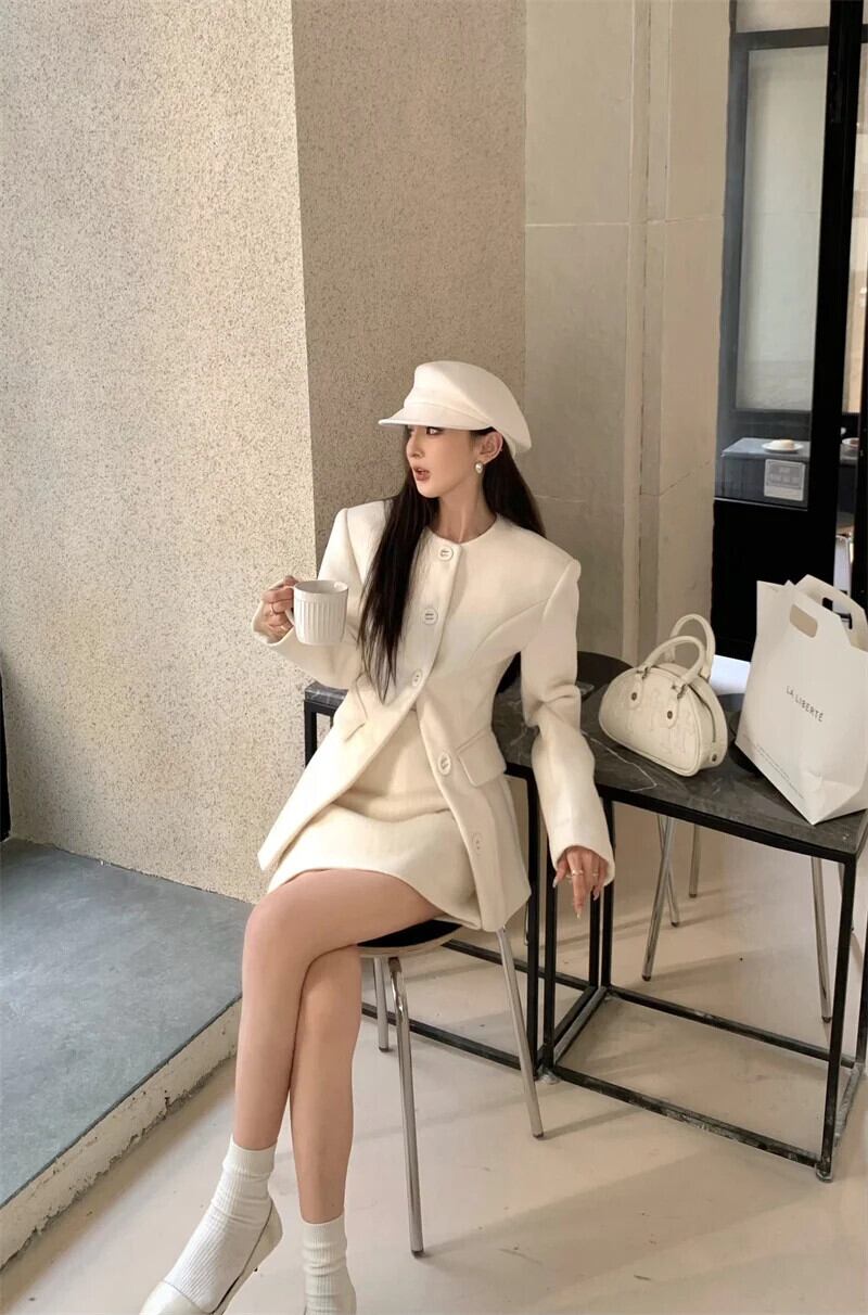 甘いホットガールスーツ秋 O ネック長袖ウールスーツジャケット A ラインミニスカート 2 点セット ロング 大人ガーリー スウィート キュート カジュアル オータム 秋物 Oネック Aライン
