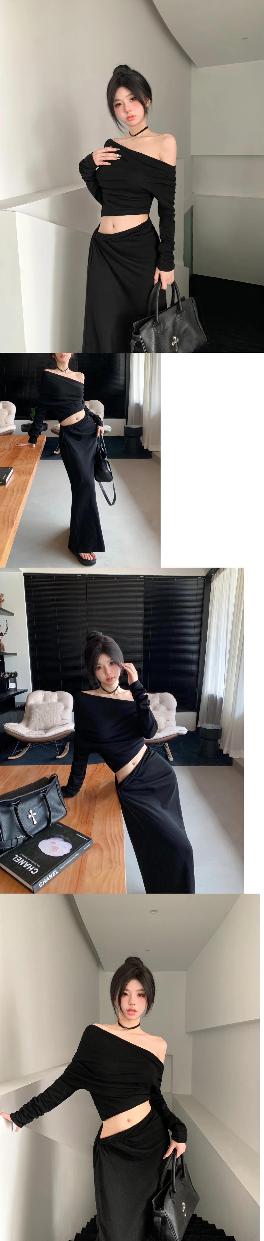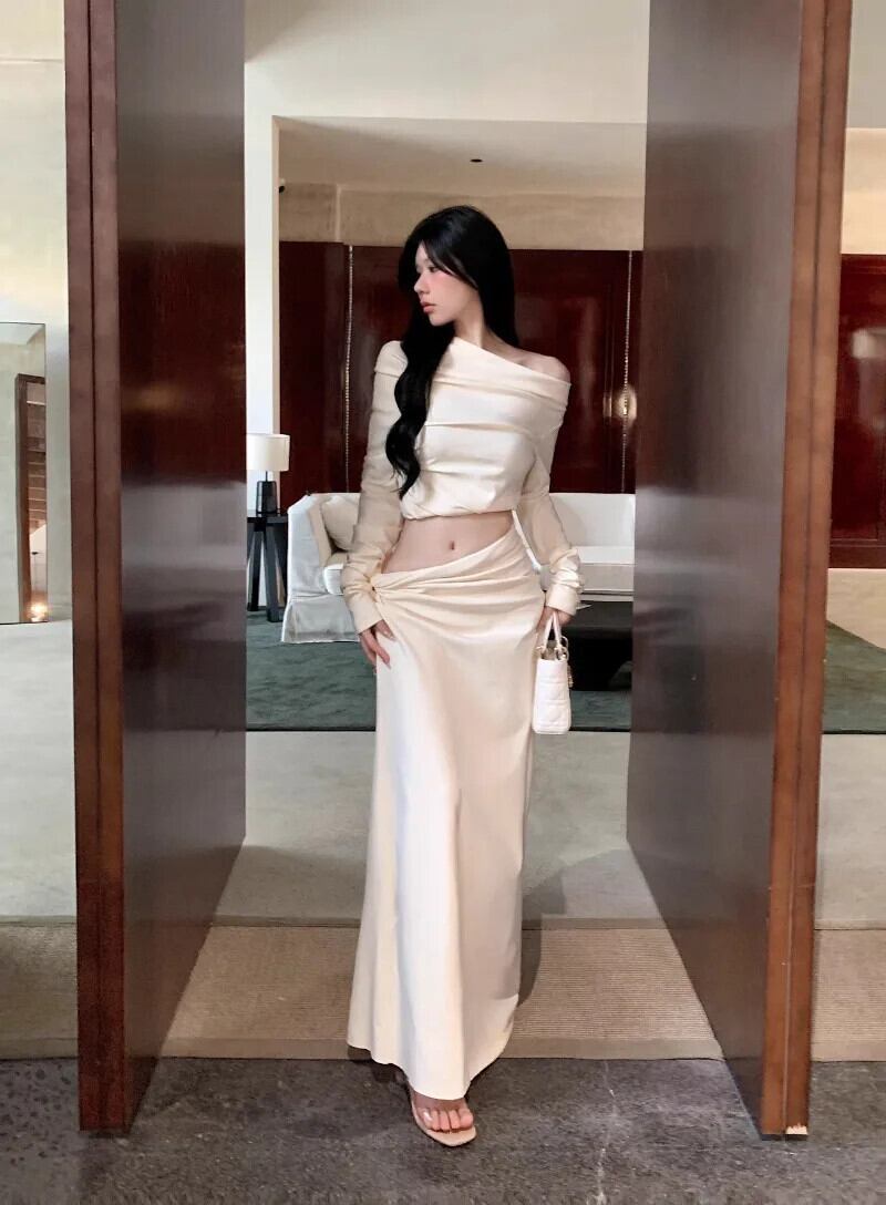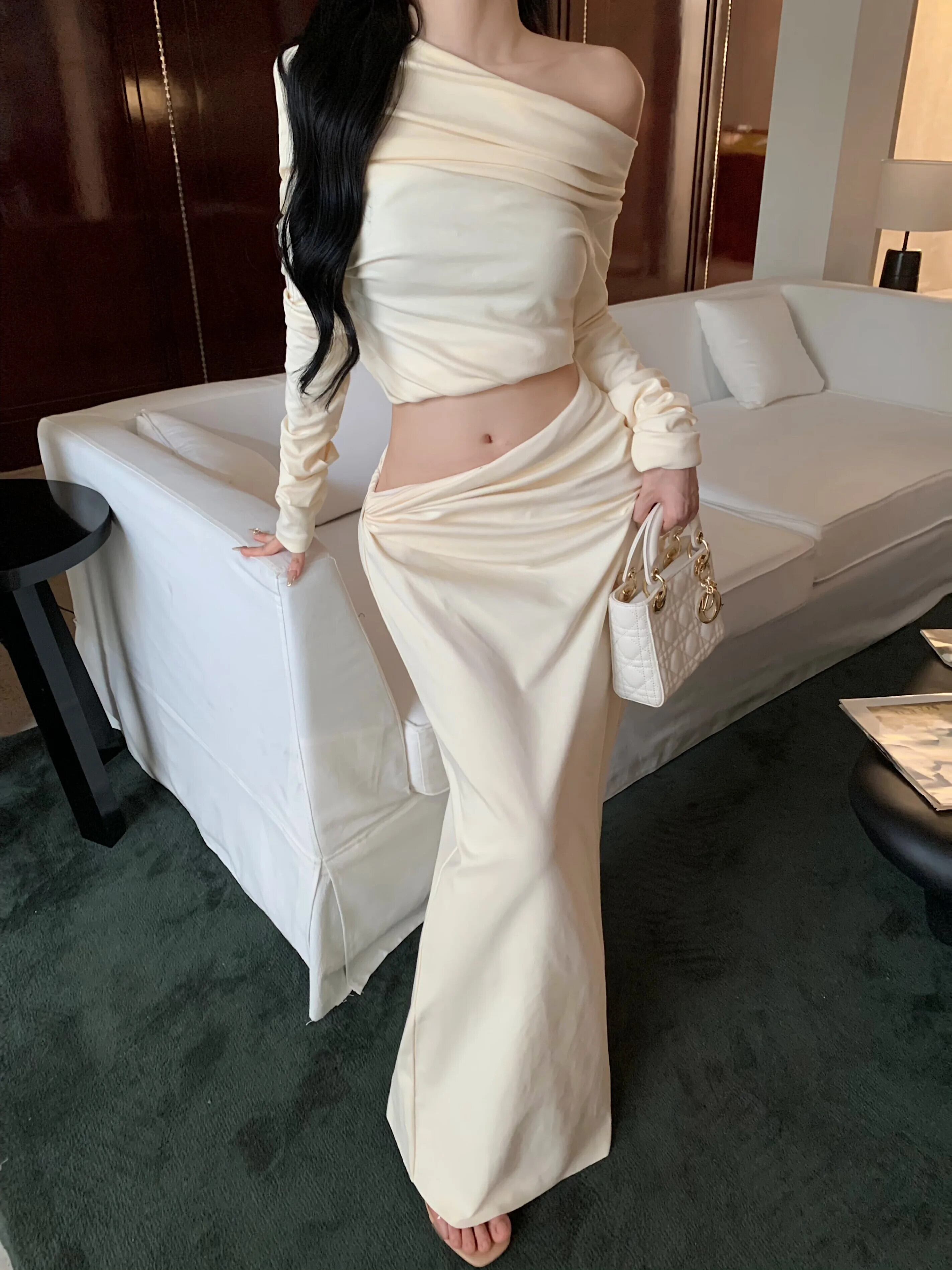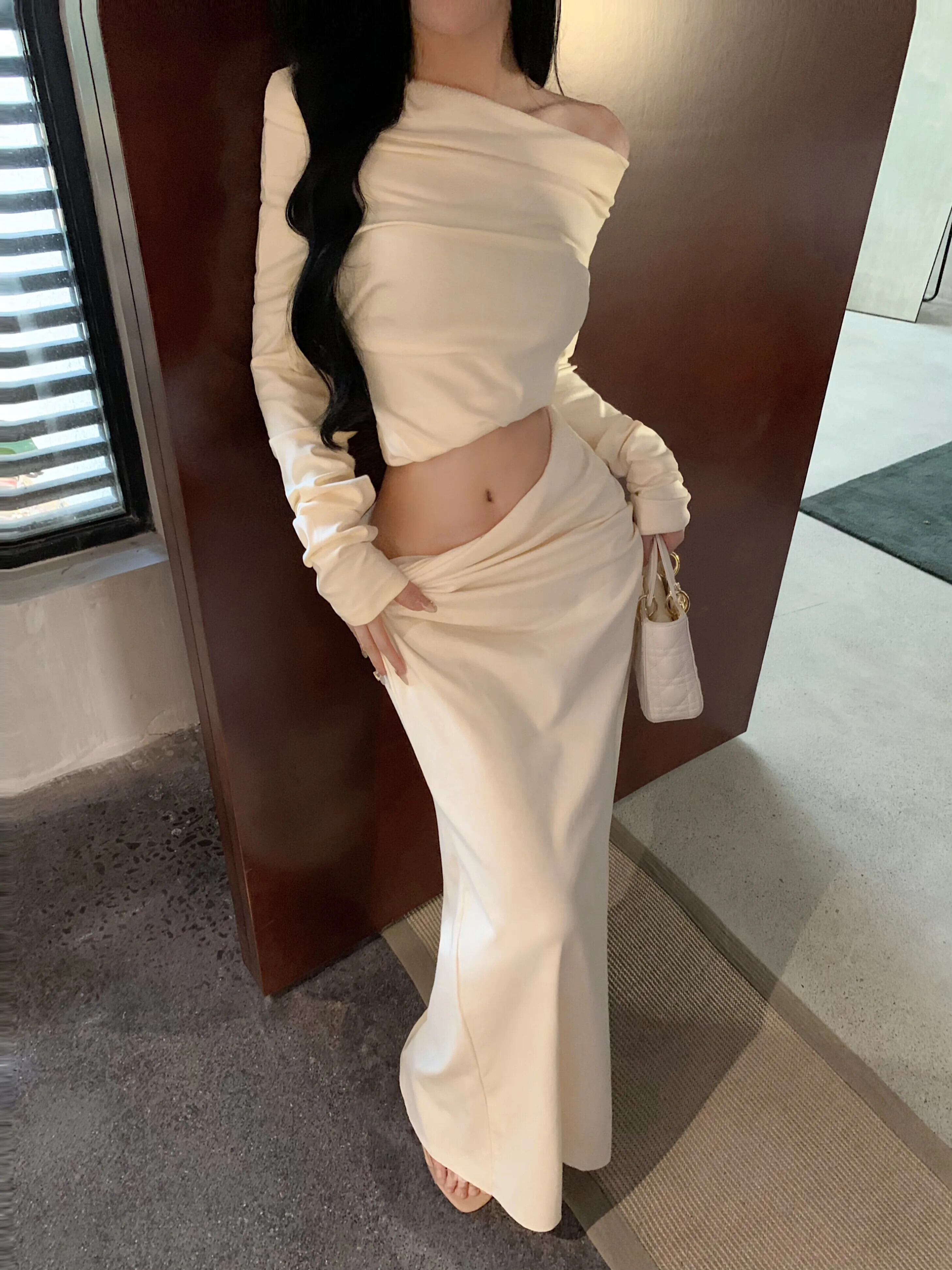 甘いホットガールスーツ春オフショルダー長袖トップウエストマーメイドスカートツーピースセット ロング 大人ガーリー スウィート キュート カジュアル スプリング 春物