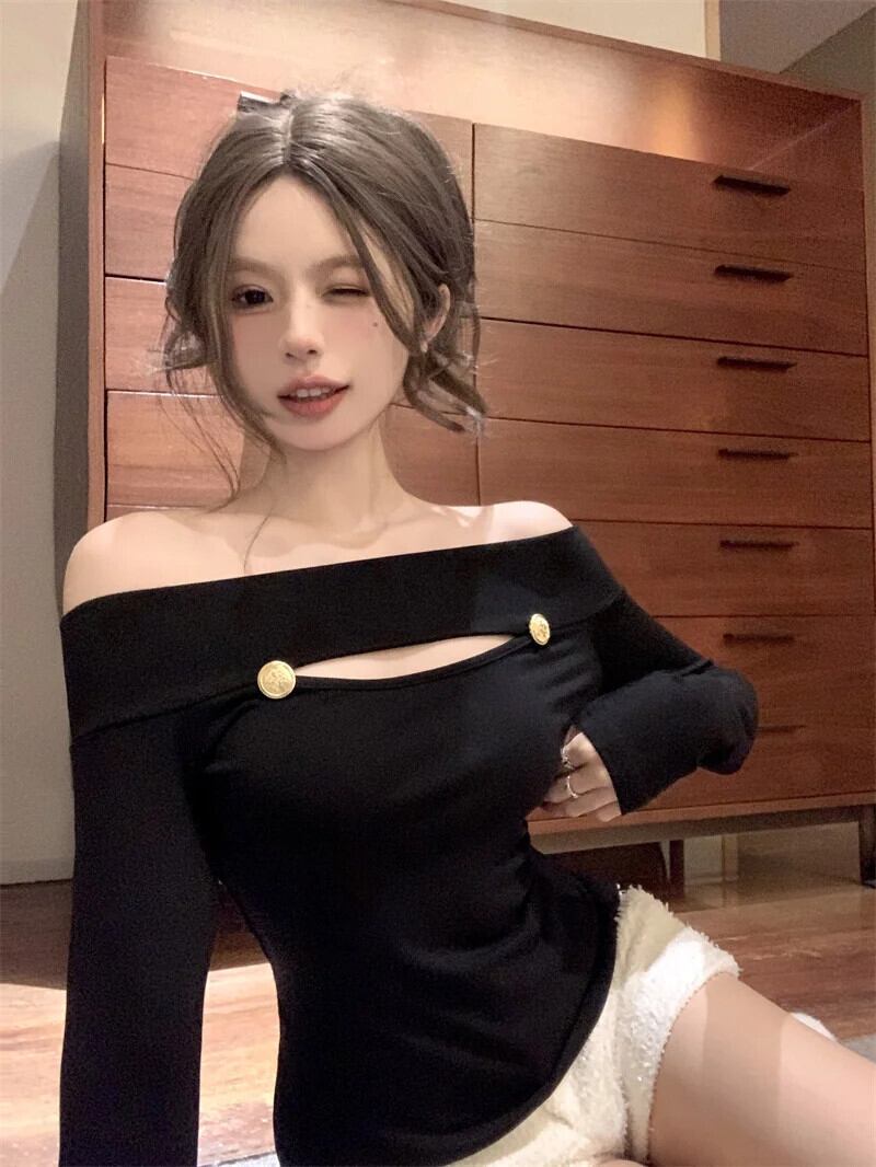 純粋セクシーオフショルダー長袖 Tシャツ秋と冬スリムフィットショートアンダーレイトップ ロング オータム 秋物 ウィンター 冬物