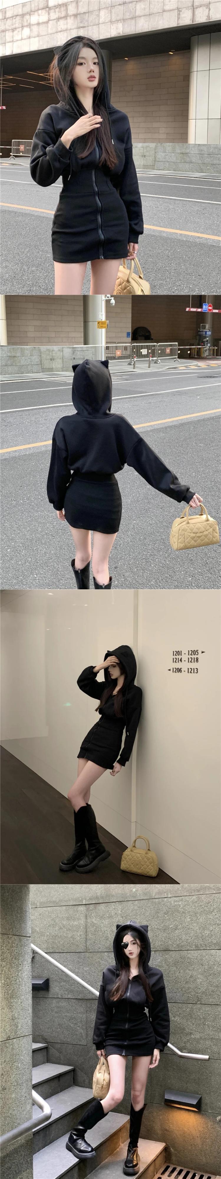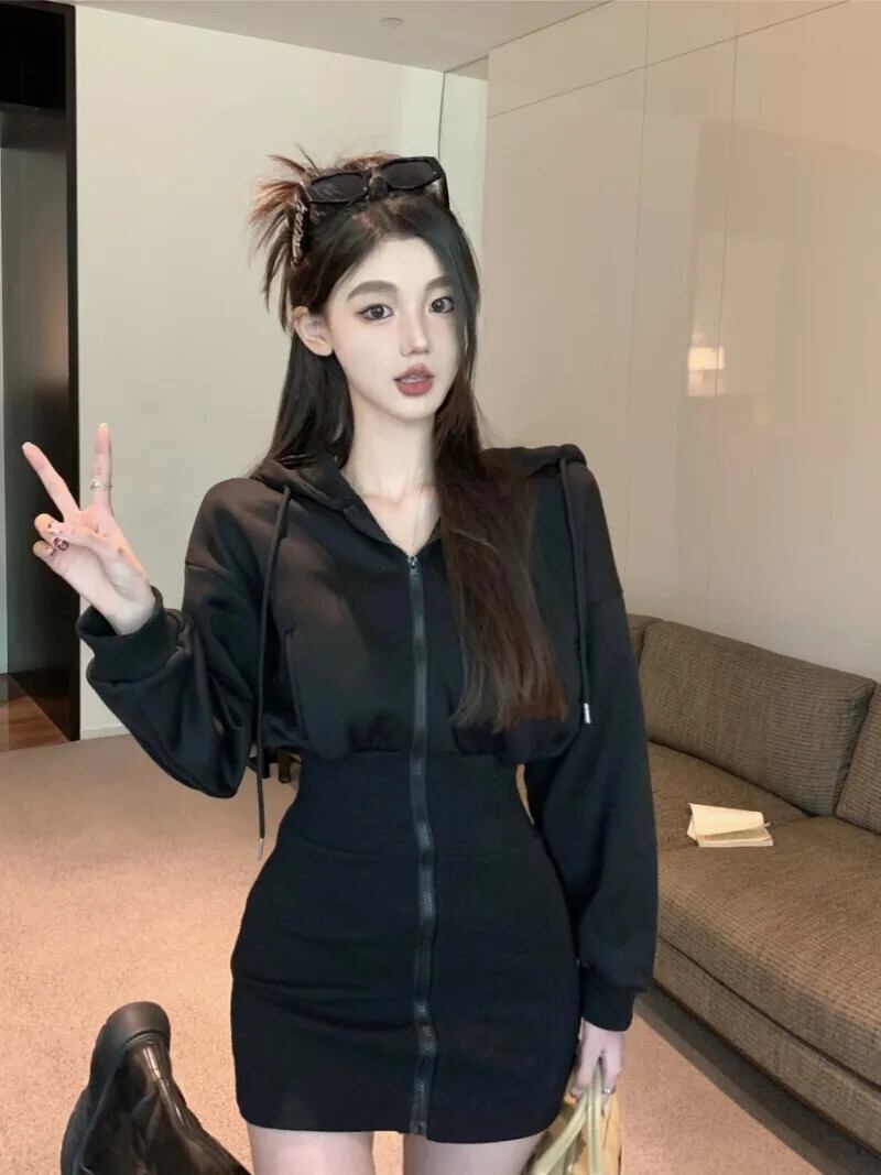 甘いホットガールソリッドカラーフード付きドレス春スリムフィットウエストラップヒップジッパーショートドレス 大人ガーリー スウィート キュート カジュアル スプリング 春物