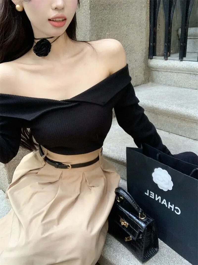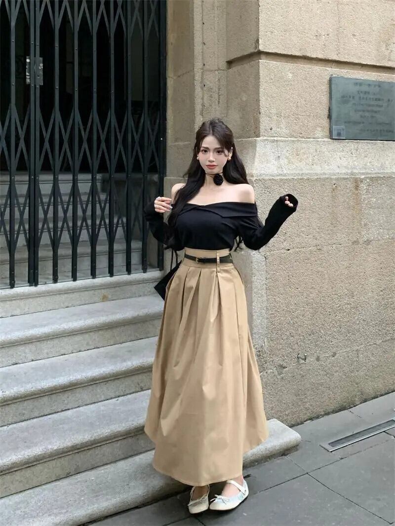 純粋セクシー甘いホットガールスーツ春オフショルダートップウエスト A ラインロングスカート 2 点セット 大人ガーリー スウィート キュート カジュアル スプリング 春物 Aライン